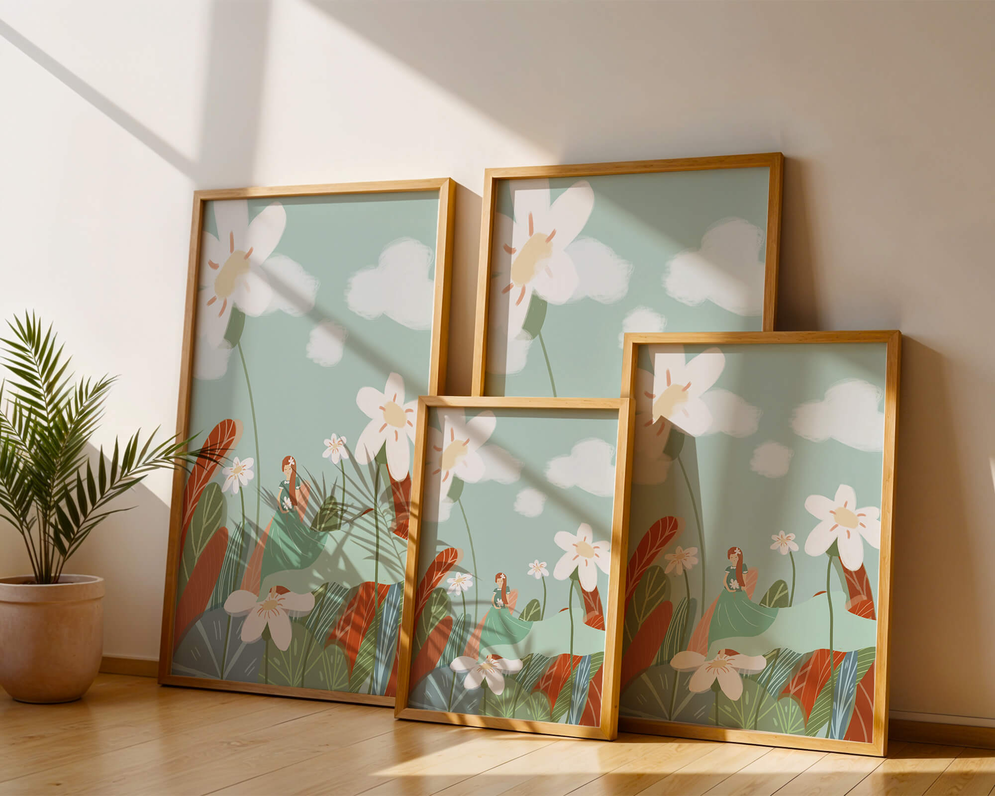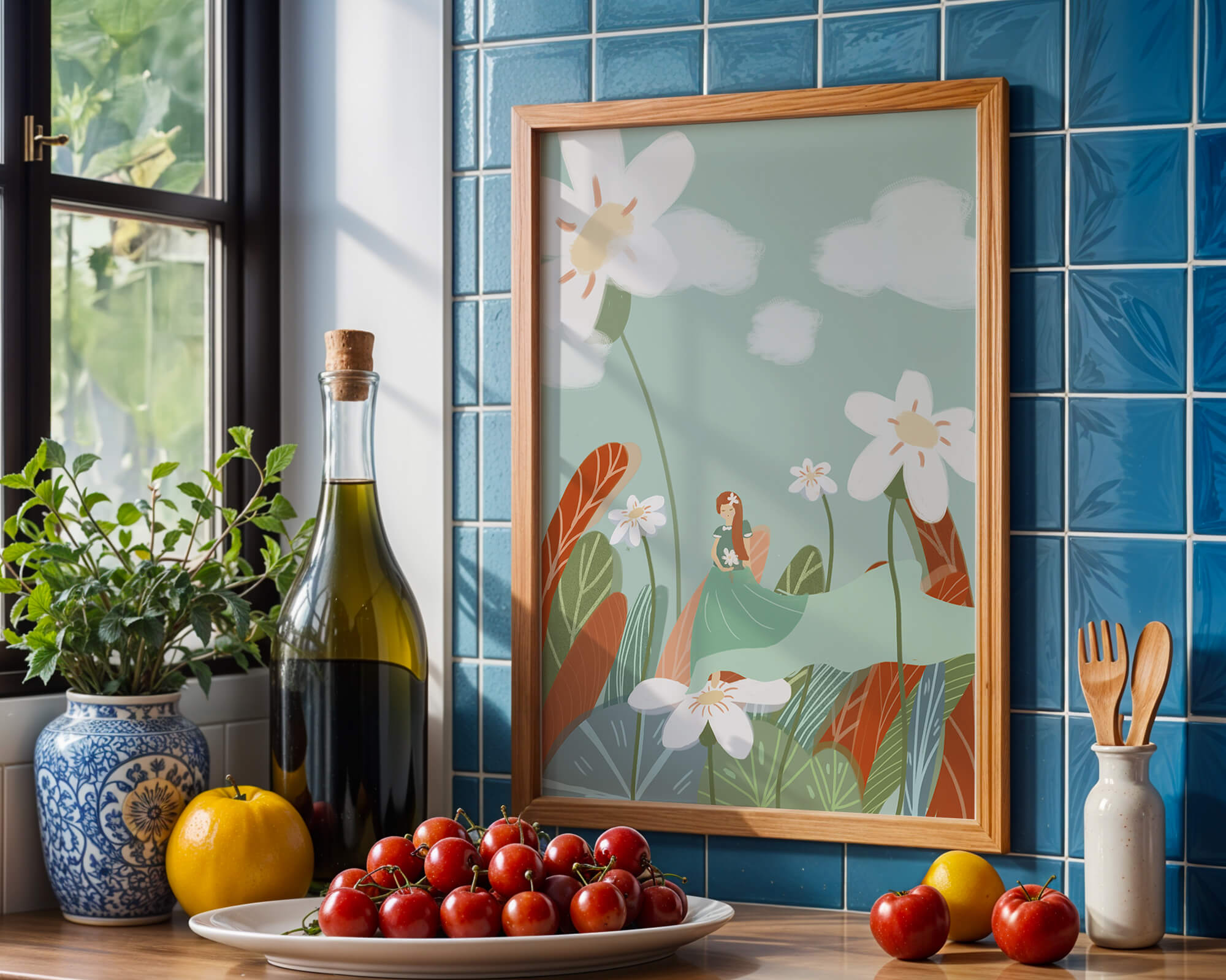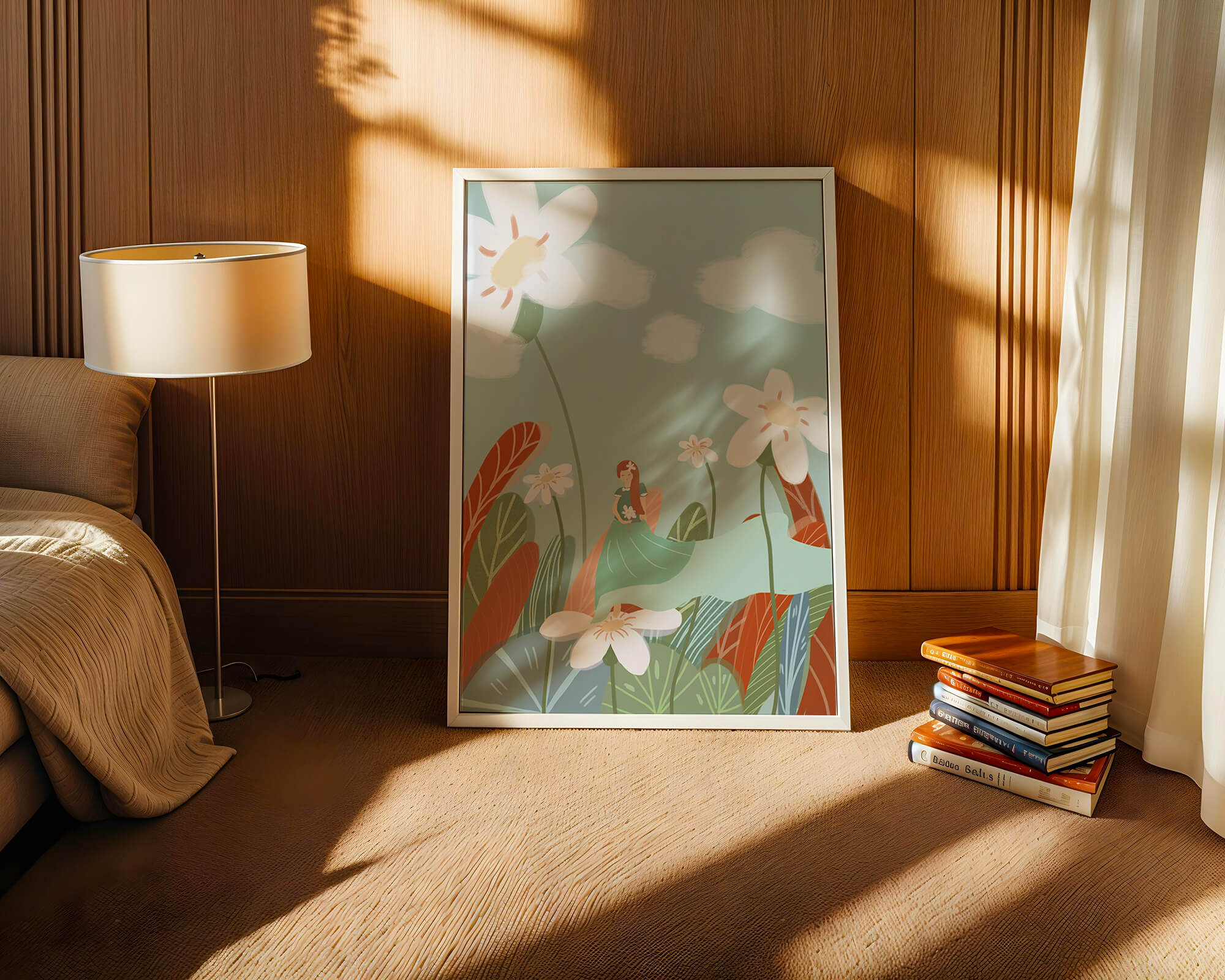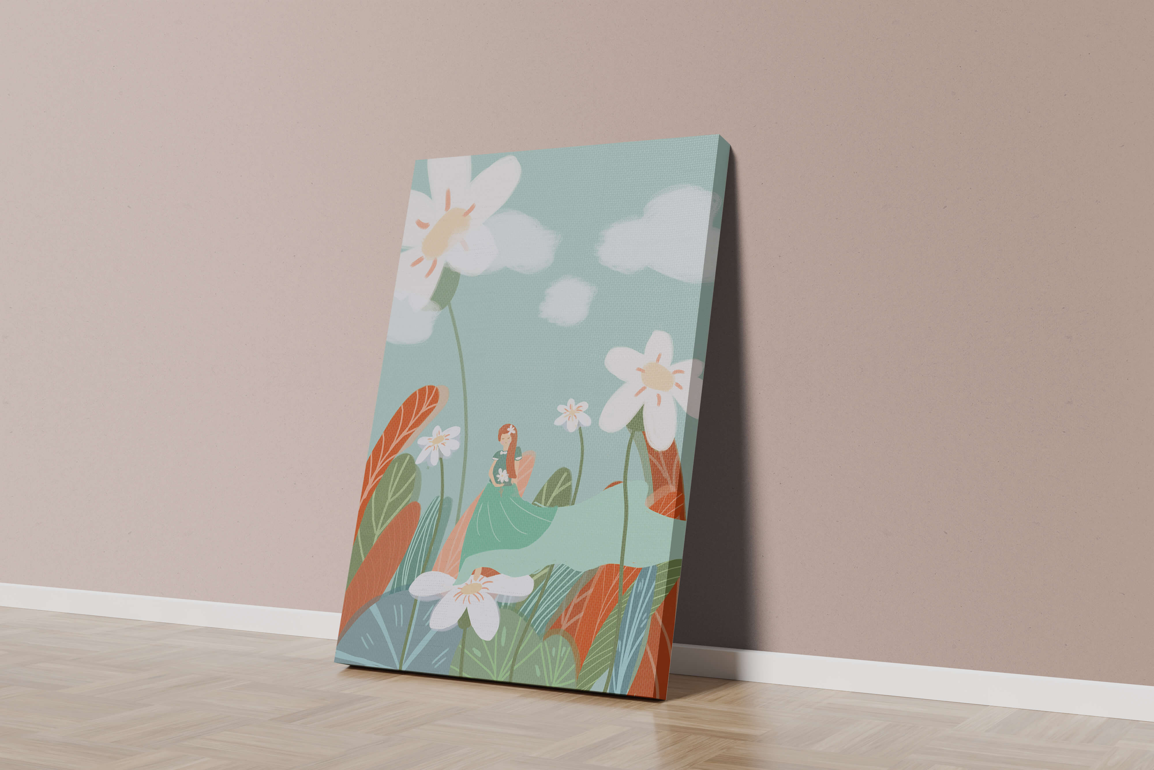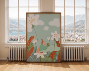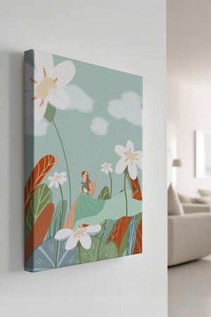 В центре этой магической обстановки женщина в струящемся зеленом платье держит маленький цветок, как будто она часть этого волшебного мира. Яркие цвета красного, зеленого и розового доминируют на заднем плане, с большими ромашками и пышной листвой, устремляющейся к пастельному небу. Взаимодействие форм и оттенков вызывает чувство удивления, делая его идеальным для детской комнаты или пространства, вдохновленного природой. Гармоничное сочетание художественных элементов рисует спокойную картину, которая вовлекает зрителей в этот фантастический мир. Идеальная для домашнего декора, эта иллюстрация приносит свежий штрих природы и воображения на любую стену, завораживая как детей, так и взрослых своей игривой сущностью.| Тип |