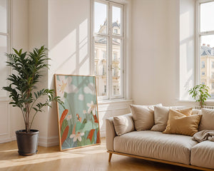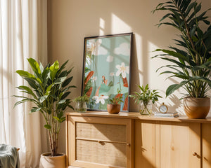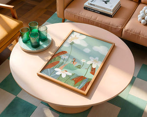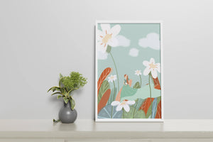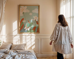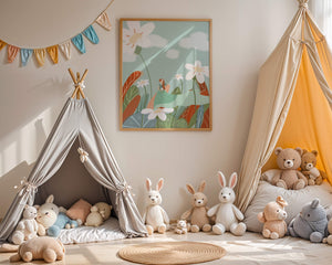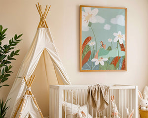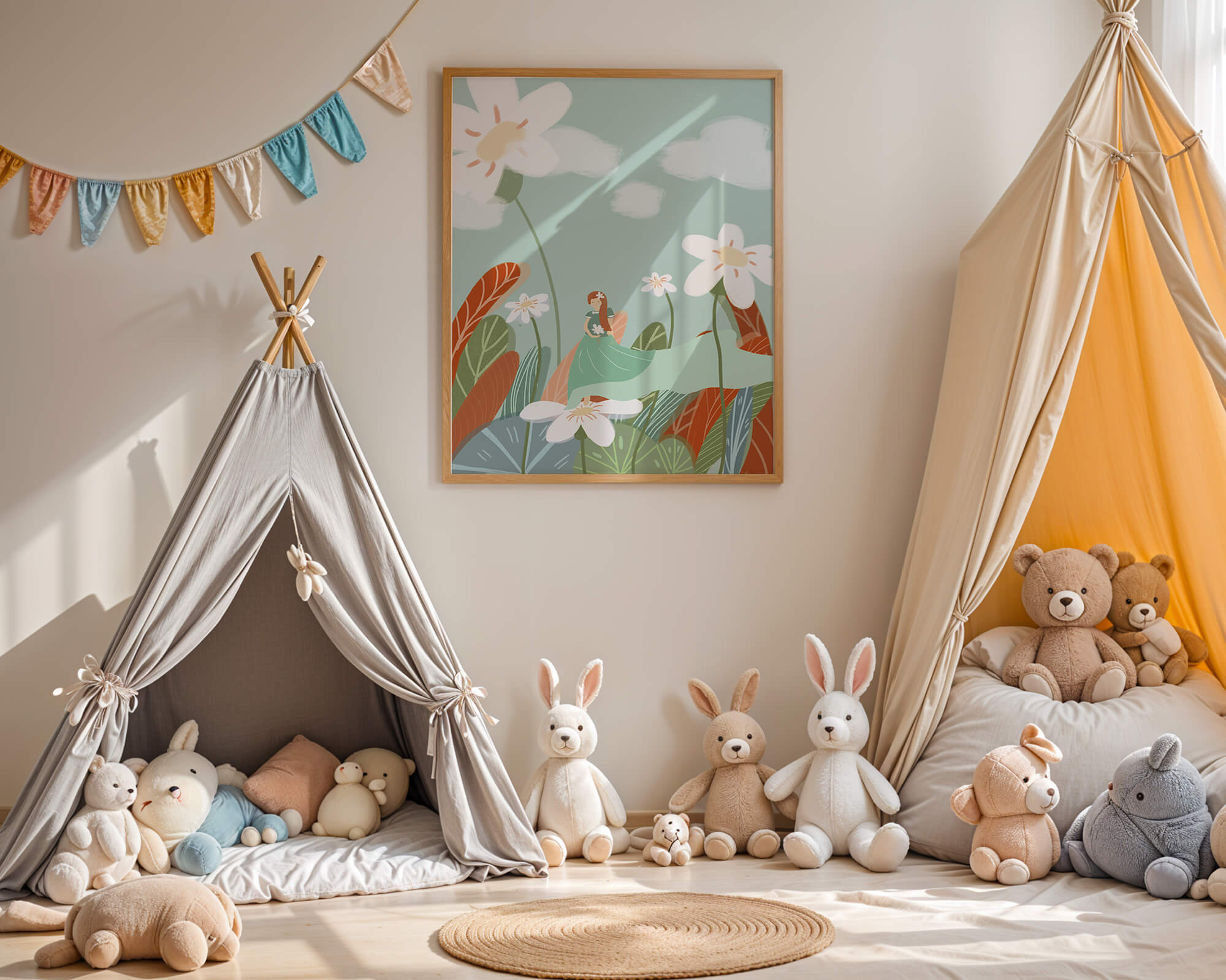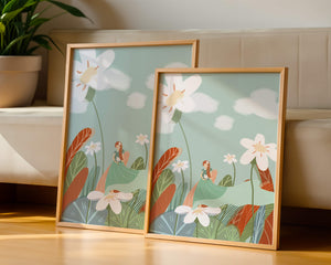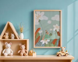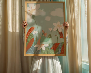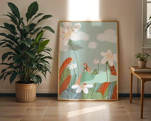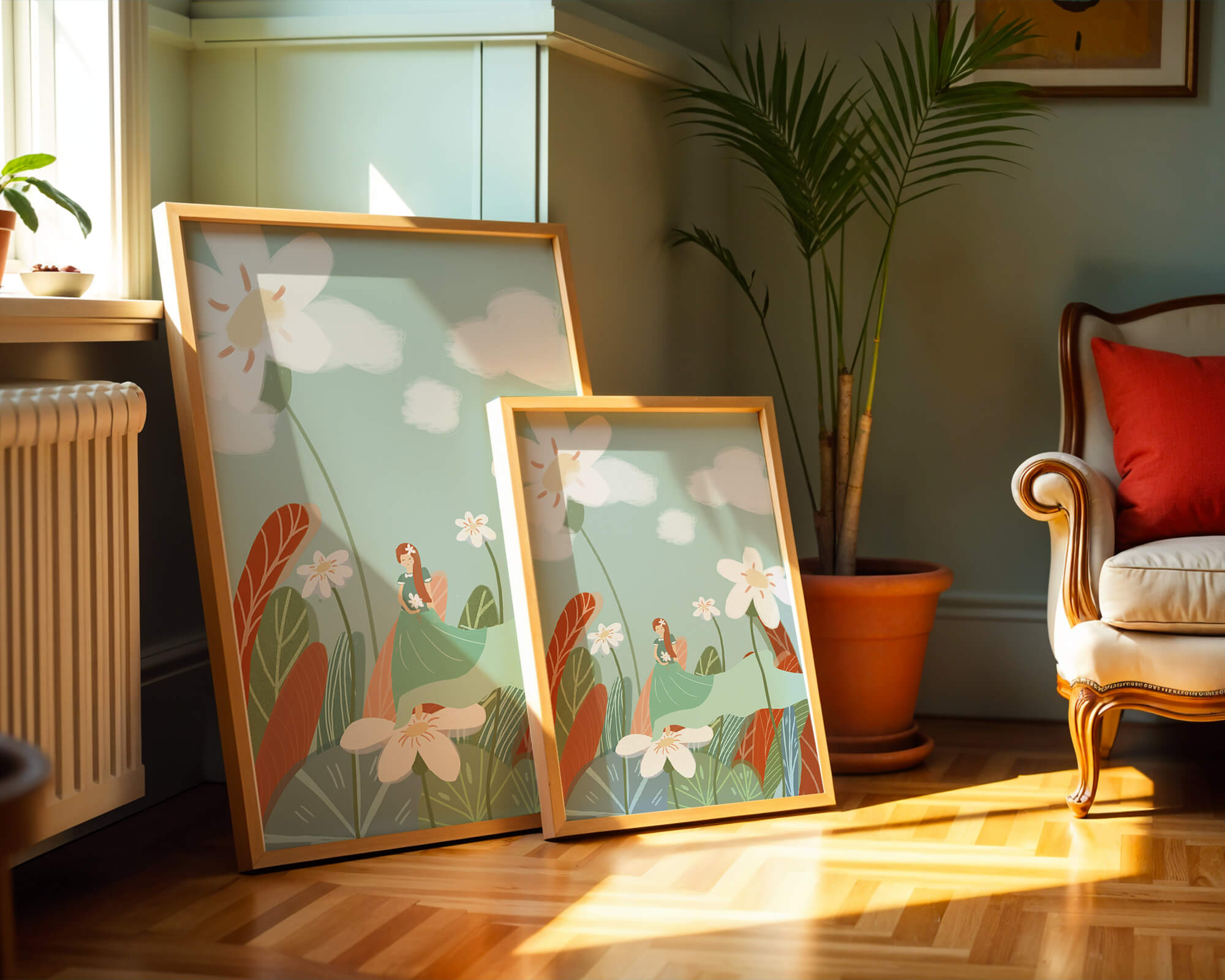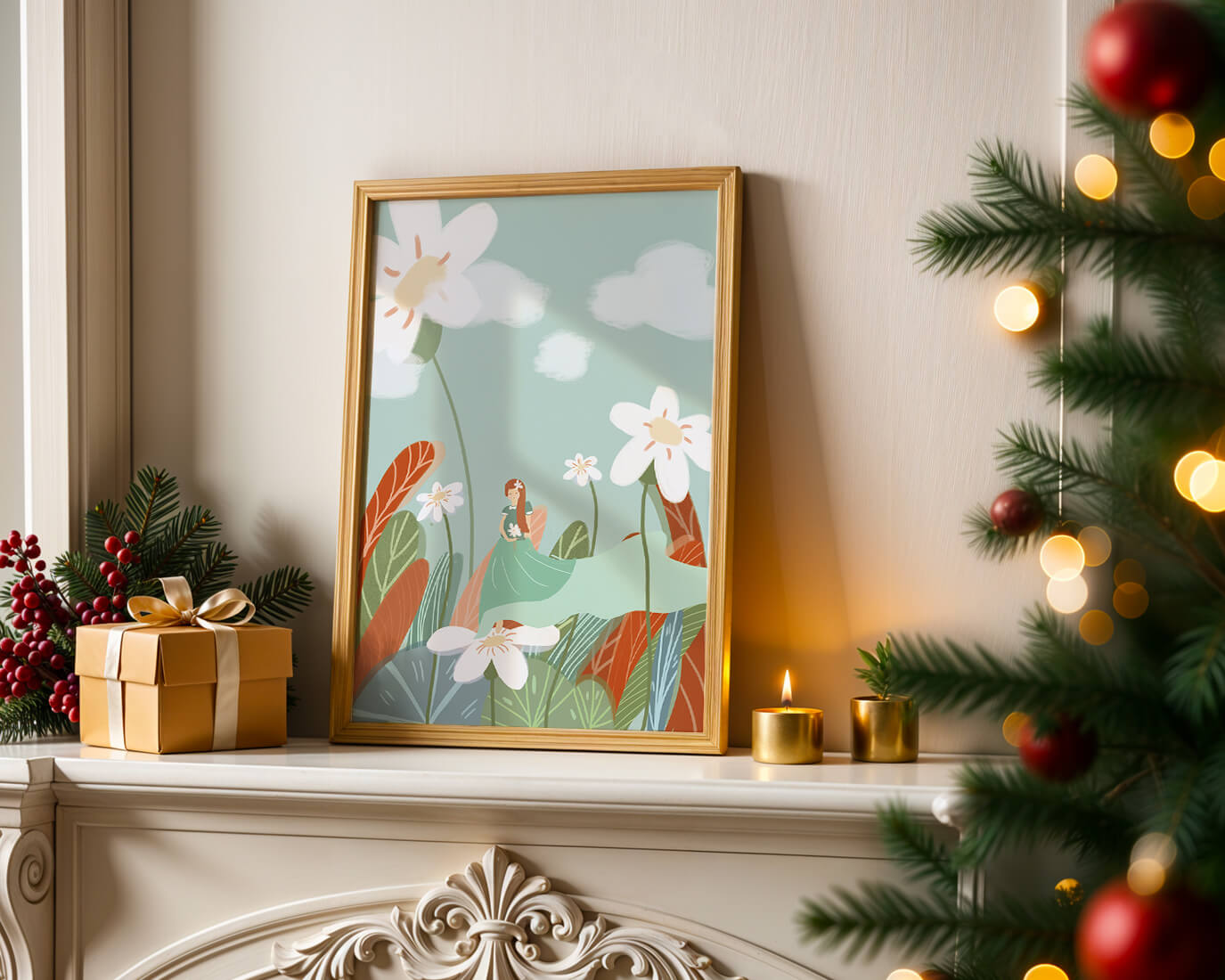 В центре этой магической обстановки женщина в струящемся зеленом платье держит маленький цветок, как будто она часть этого волшебного мира. Яркие цвета красного, зеленого и розового доминируют на заднем плане, с большими ромашками и пышной листвой, устремляющейся к пастельному небу. Взаимодействие форм и оттенков вызывает чувство удивления, делая его идеальным для детской комнаты или пространства, вдохновленного природой. Гармоничное сочетание художественных элементов рисует спокойную картину, которая вовлекает зрителей в этот фантастический мир. Идеальная для домашнего декора, эта иллюстрация приносит свежий штрих природы и воображения на любую стену, завораживая как детей, так и взрослых своей игривой сущностью.| Тип |