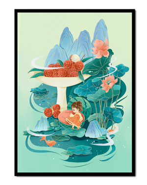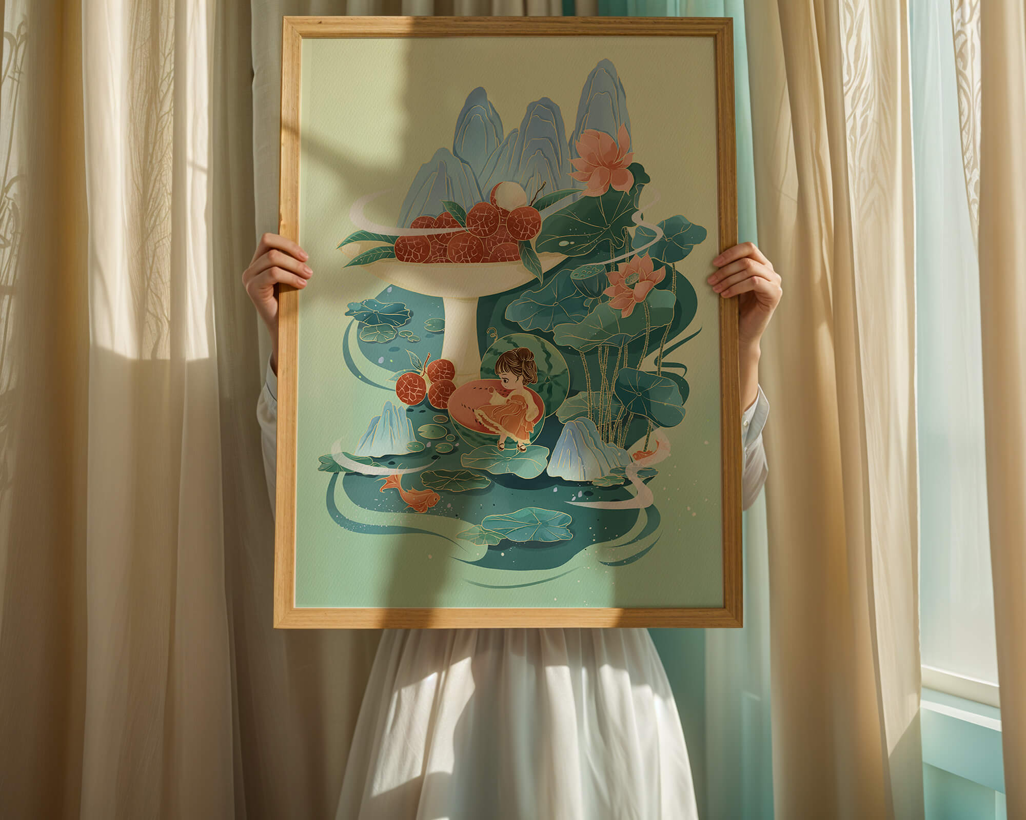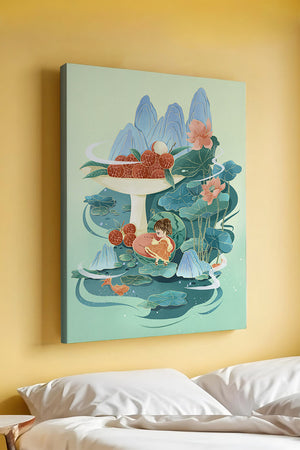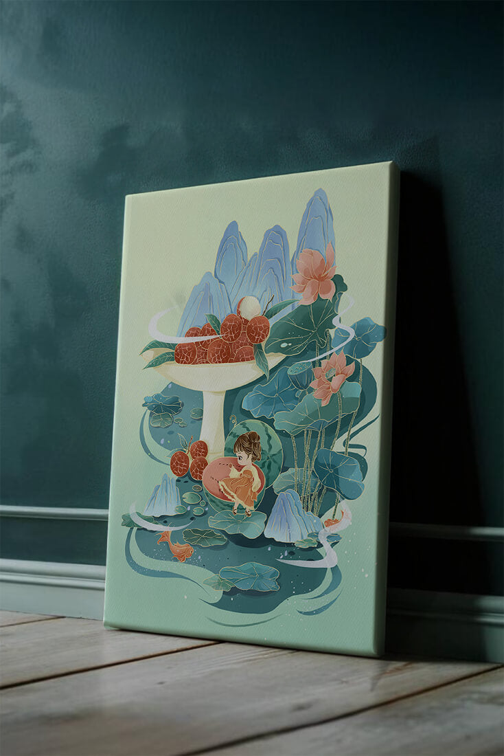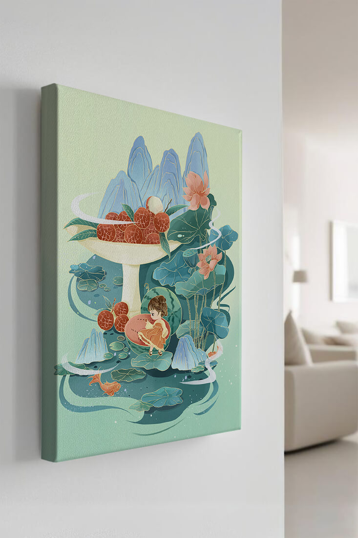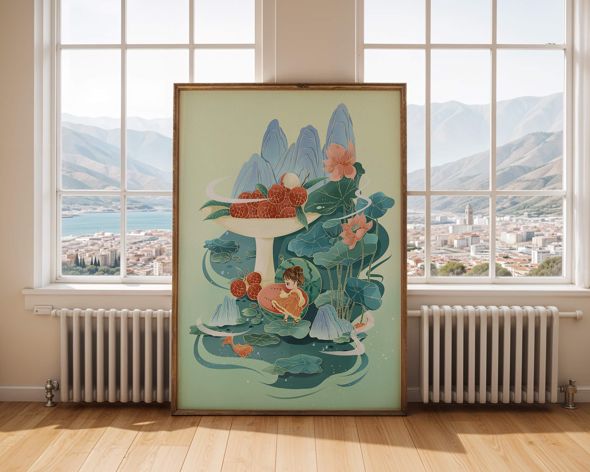 На изображении игривая интеграция молодой девушки, держащей кусочек арбуза и сидящей на большом листе лотоса, создаёт чувство любопытства и наивности. Вокруг неё крупные фрукты личи отдыхают в элегантной вазе на пьедестале. На заднем плане изображены эфемерные голубые горы, которые добавляют глубину композиции, вызывая мечтательный пейзаж. Произведение улавливает уникальный баланс между реализмом и воображением, делая его очаровательным элементом декора для детей или любого пространства, которое стремится вызвать удивление и прихоть. Присутствие оранжевых рыбок, плавающих среди листьев лотоса, ещё больше обогащает эту захватывающую сцену, объединяя элементы воды и жизни в связную визуальную историю.