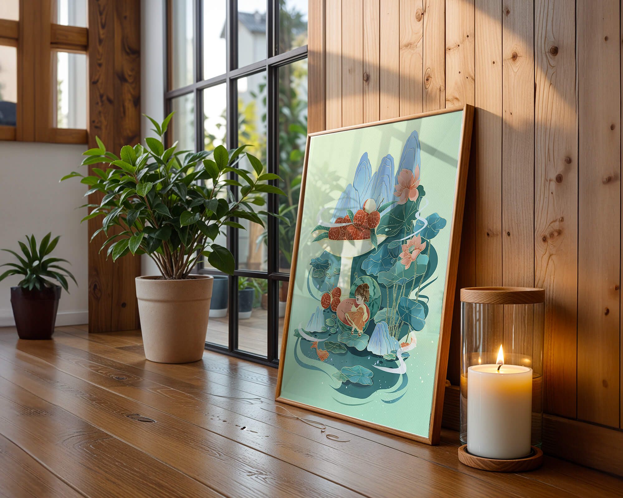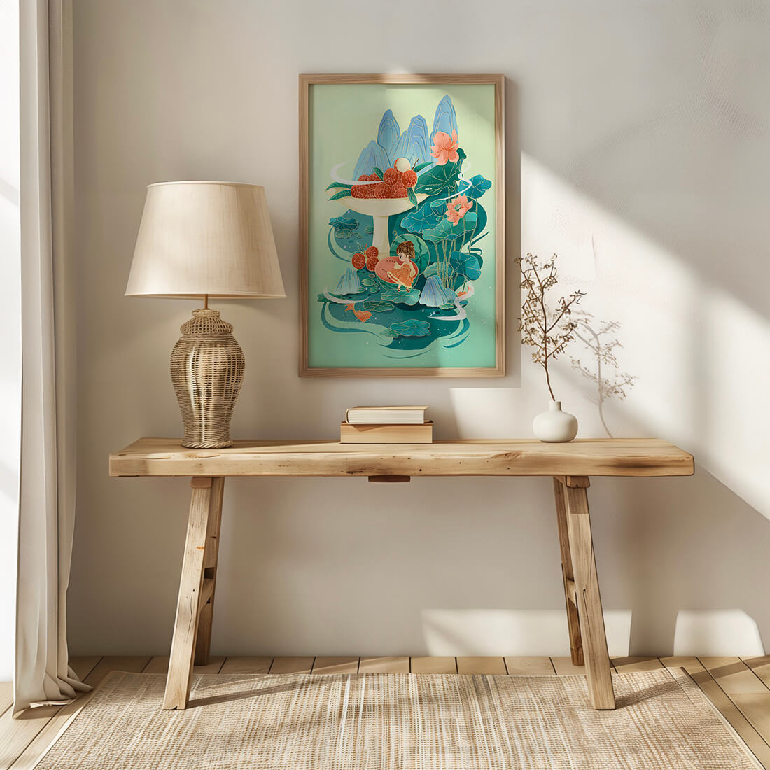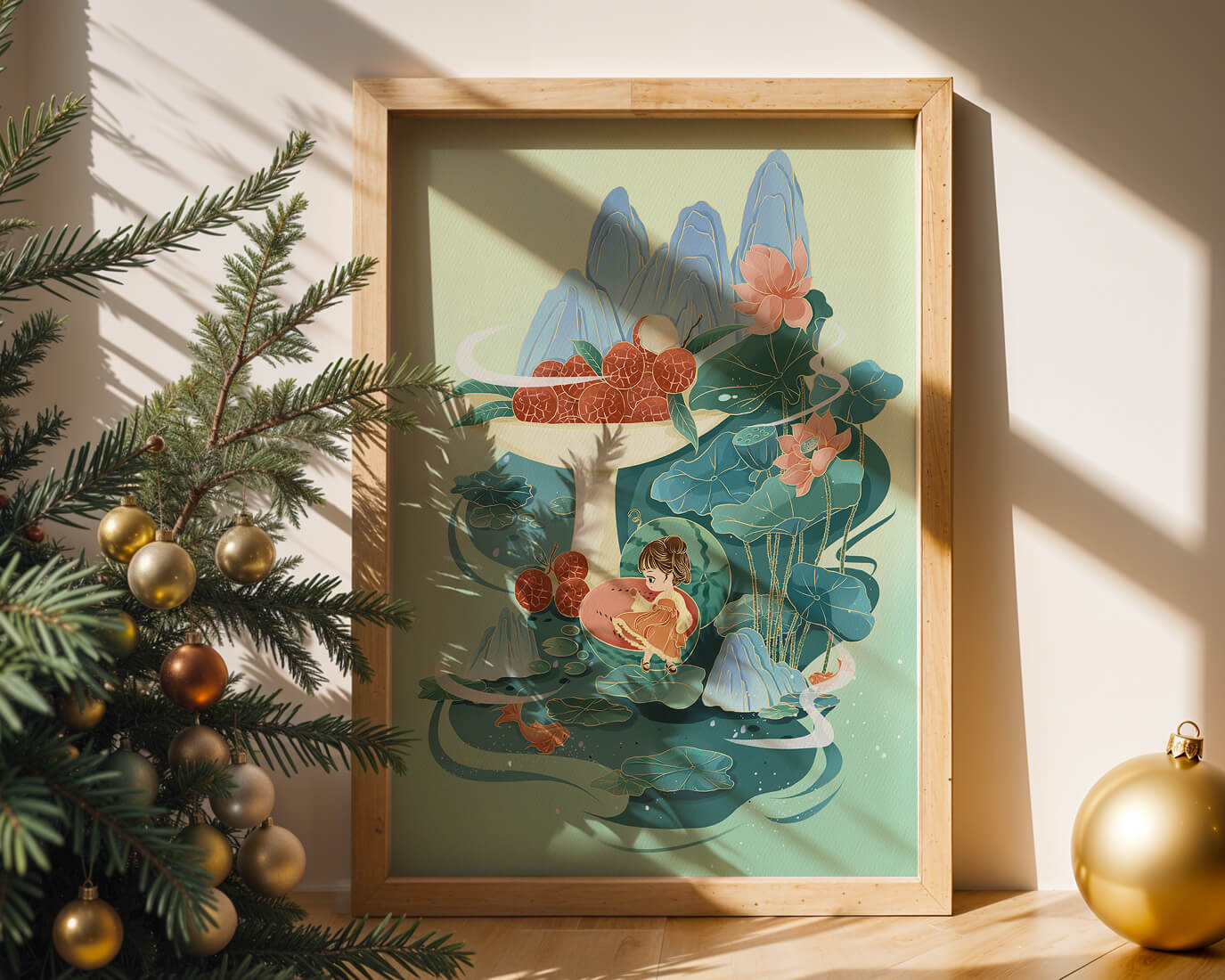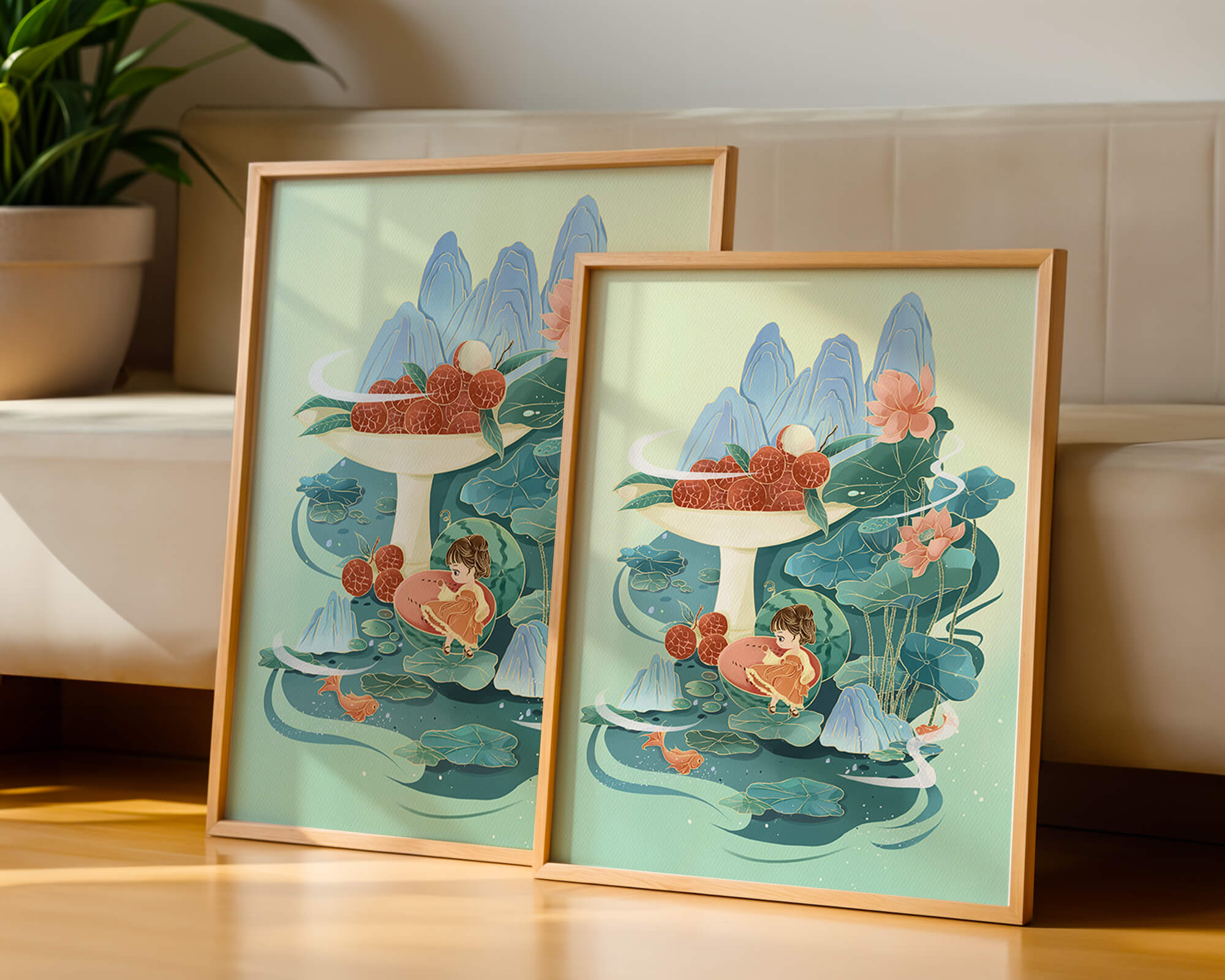 На изображении игривая интеграция молодой девушки, держащей кусочек арбуза и сидящей на большом листе лотоса, создаёт чувство любопытства и наивности. Вокруг неё крупные фрукты личи отдыхают в элегантной вазе на пьедестале. На заднем плане изображены эфемерные голубые горы, которые добавляют глубину композиции, вызывая мечтательный пейзаж. Произведение улавливает уникальный баланс между реализмом и воображением, делая его очаровательным элементом декора для детей или любого пространства, которое стремится вызвать удивление и прихоть. Присутствие оранжевых рыбок, плавающих среди листьев лотоса, ещё больше обогащает эту захватывающую сцену, объединяя элементы воды и жизни в связную визуальную историю.