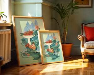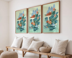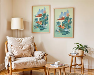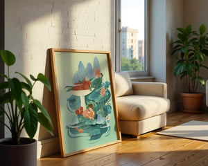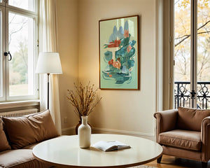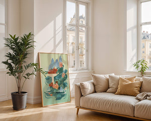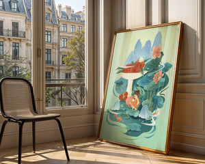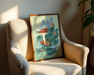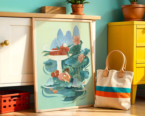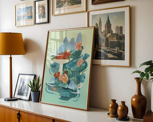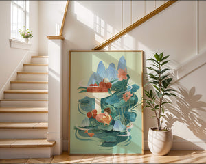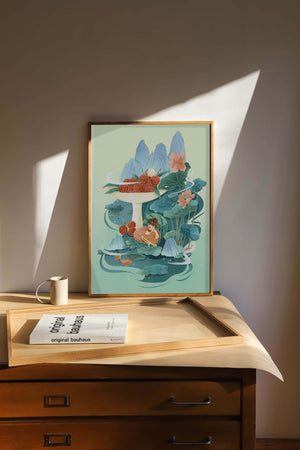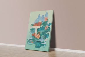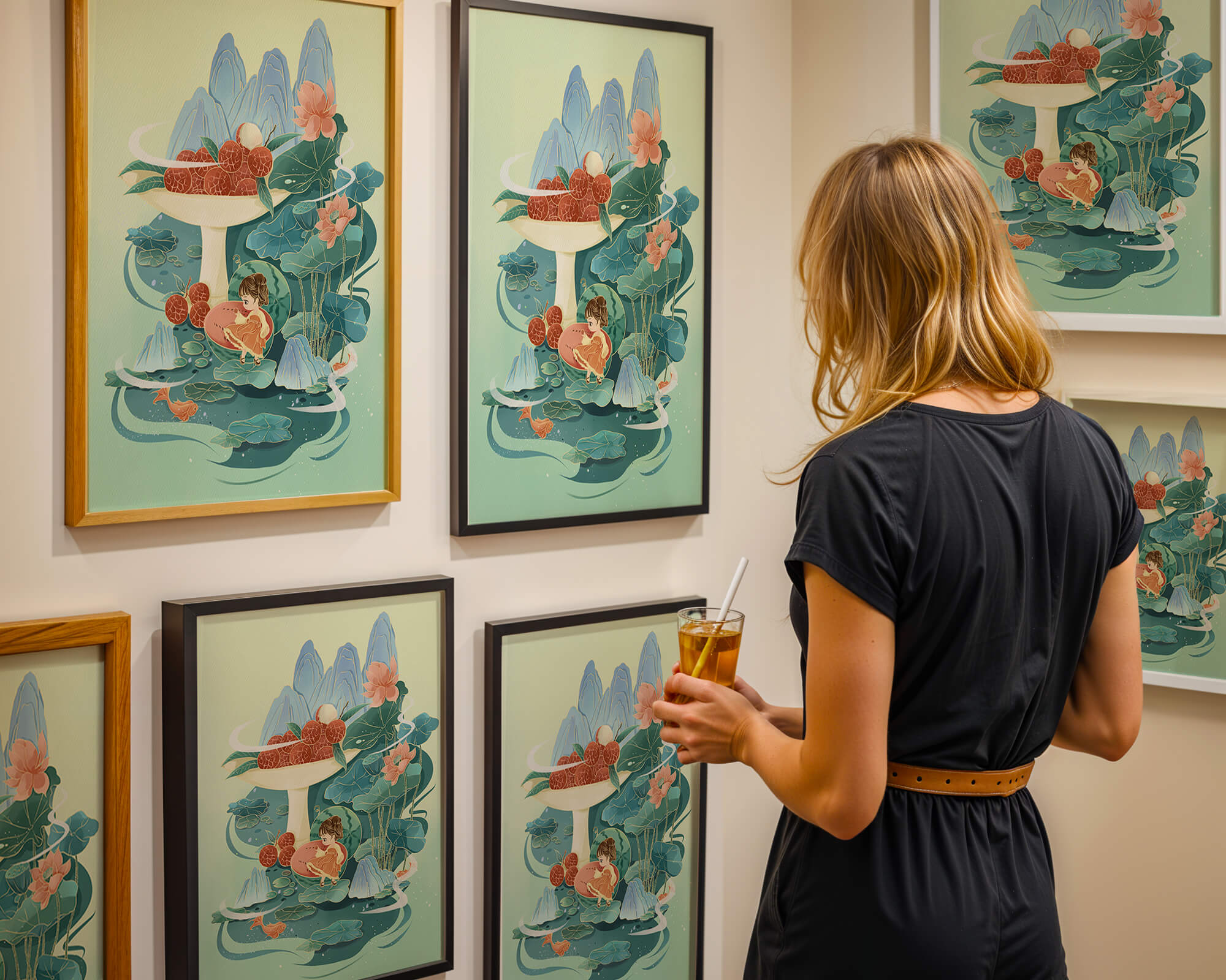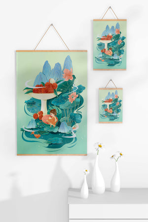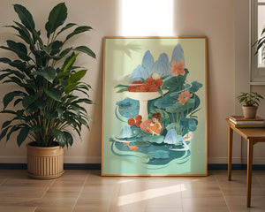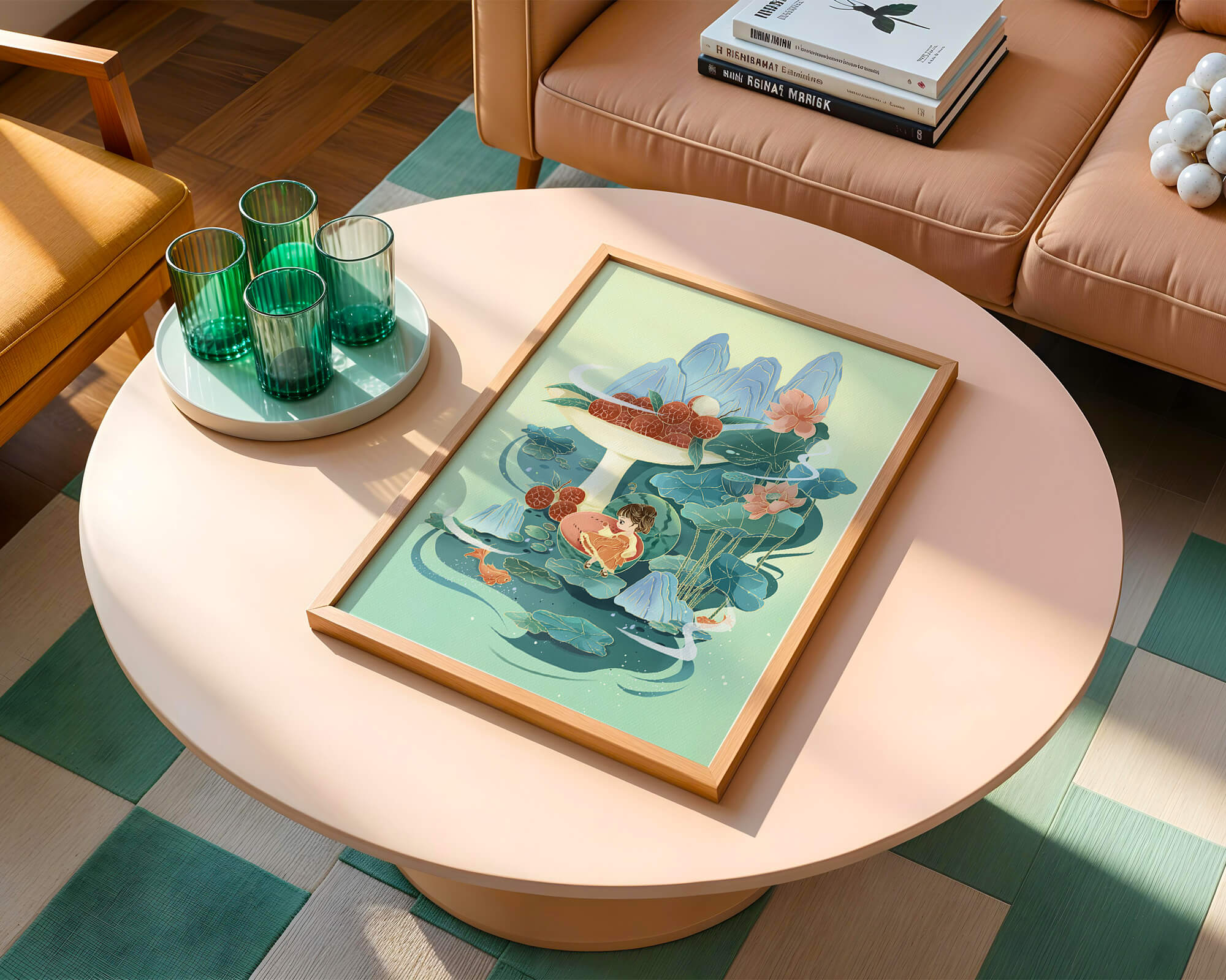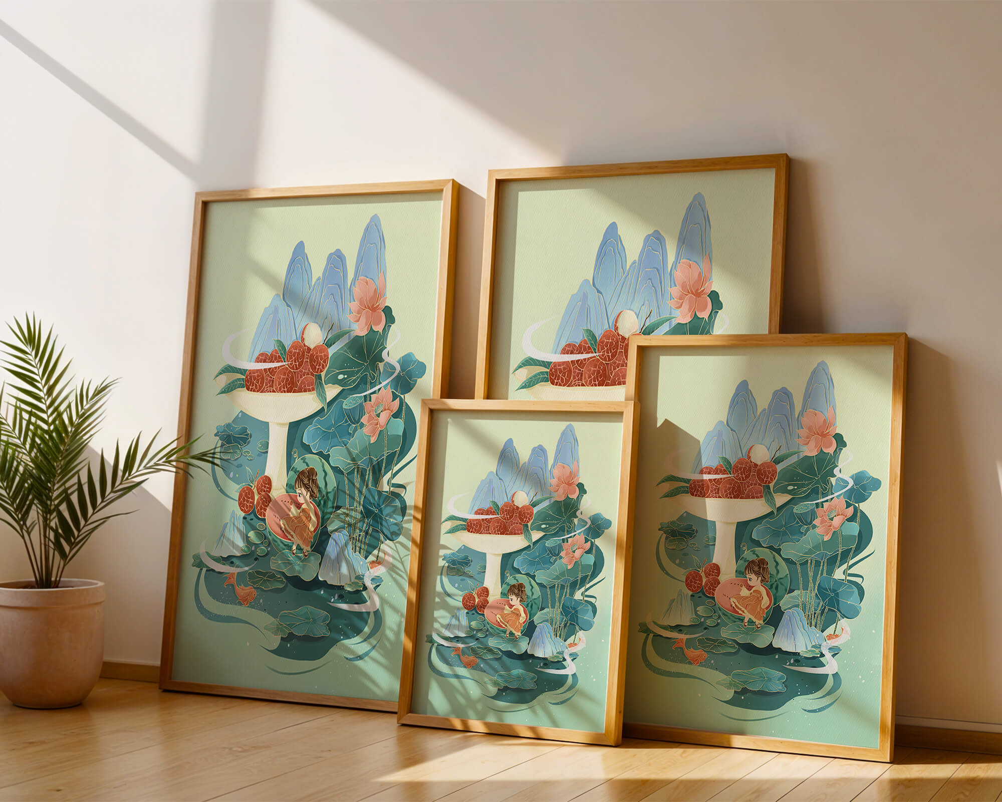 На изображении игривая интеграция молодой девушки, держащей кусочек арбуза и сидящей на большом листе лотоса, создаёт чувство любопытства и наивности. Вокруг неё крупные фрукты личи отдыхают в элегантной вазе на пьедестале. На заднем плане изображены эфемерные голубые горы, которые добавляют глубину композиции, вызывая мечтательный пейзаж. Произведение улавливает уникальный баланс между реализмом и воображением, делая его очаровательным элементом декора для детей или любого пространства, которое стремится вызвать удивление и прихоть. Присутствие оранжевых рыбок, плавающих среди листьев лотоса, ещё больше обогащает эту захватывающую сцену, объединяя элементы воды и жизни в связную визуальную историю.