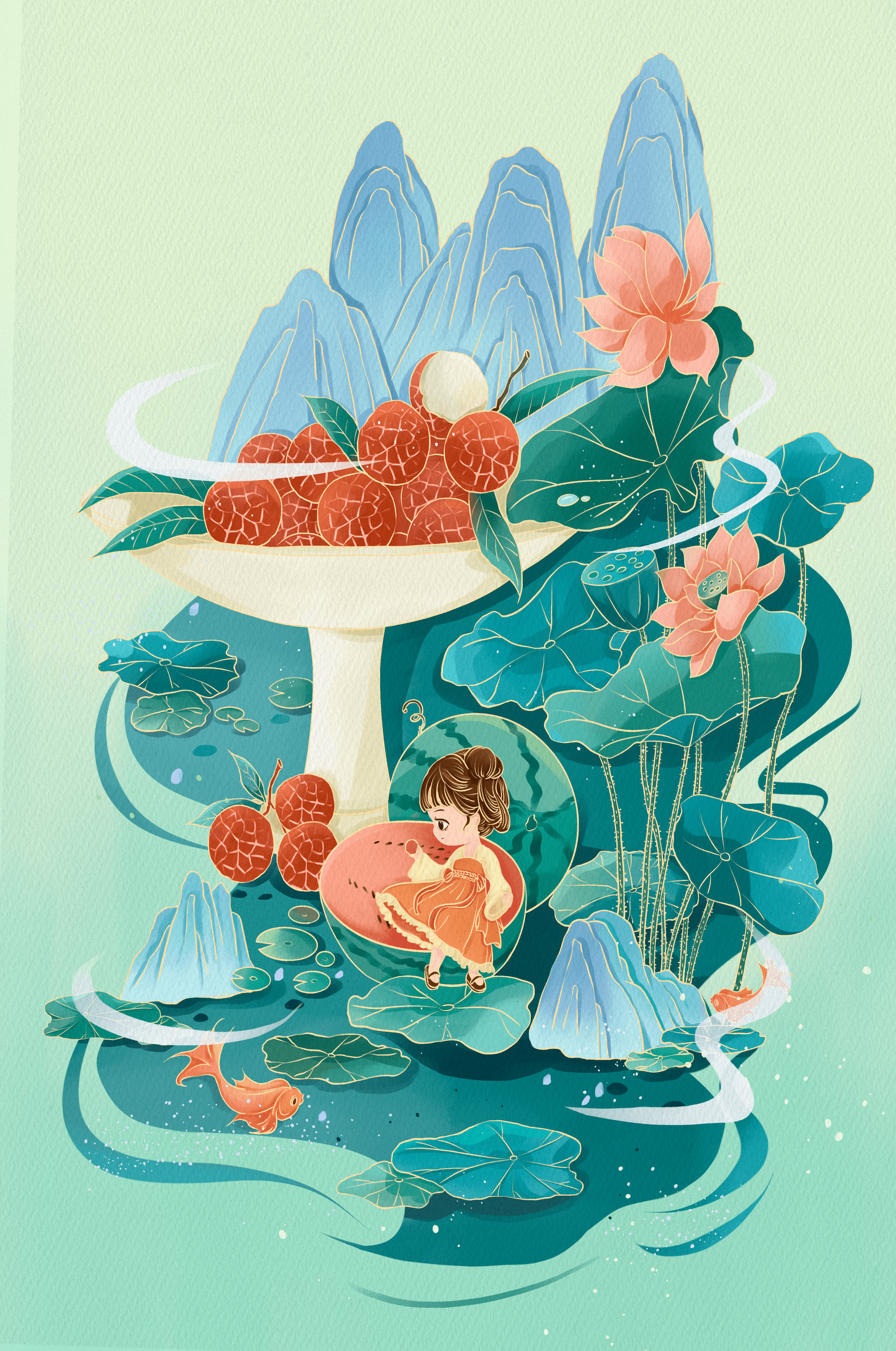 Home Ilustração de fantasia com menina, lichia e flores de lótus