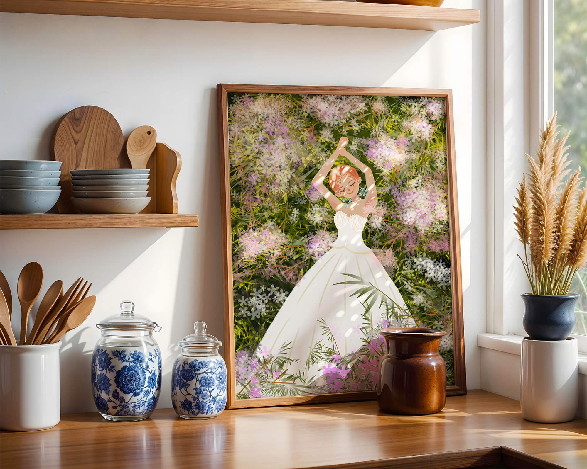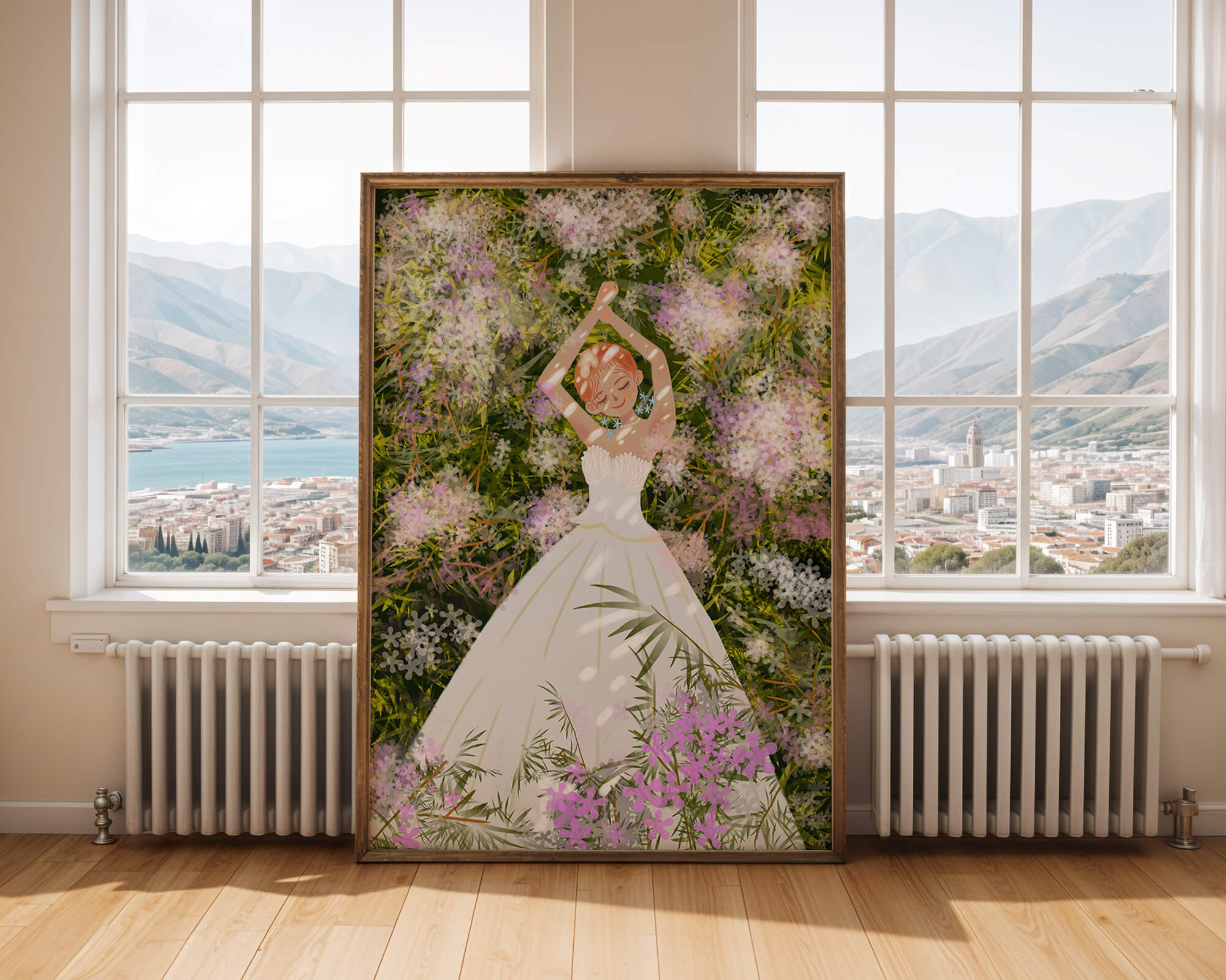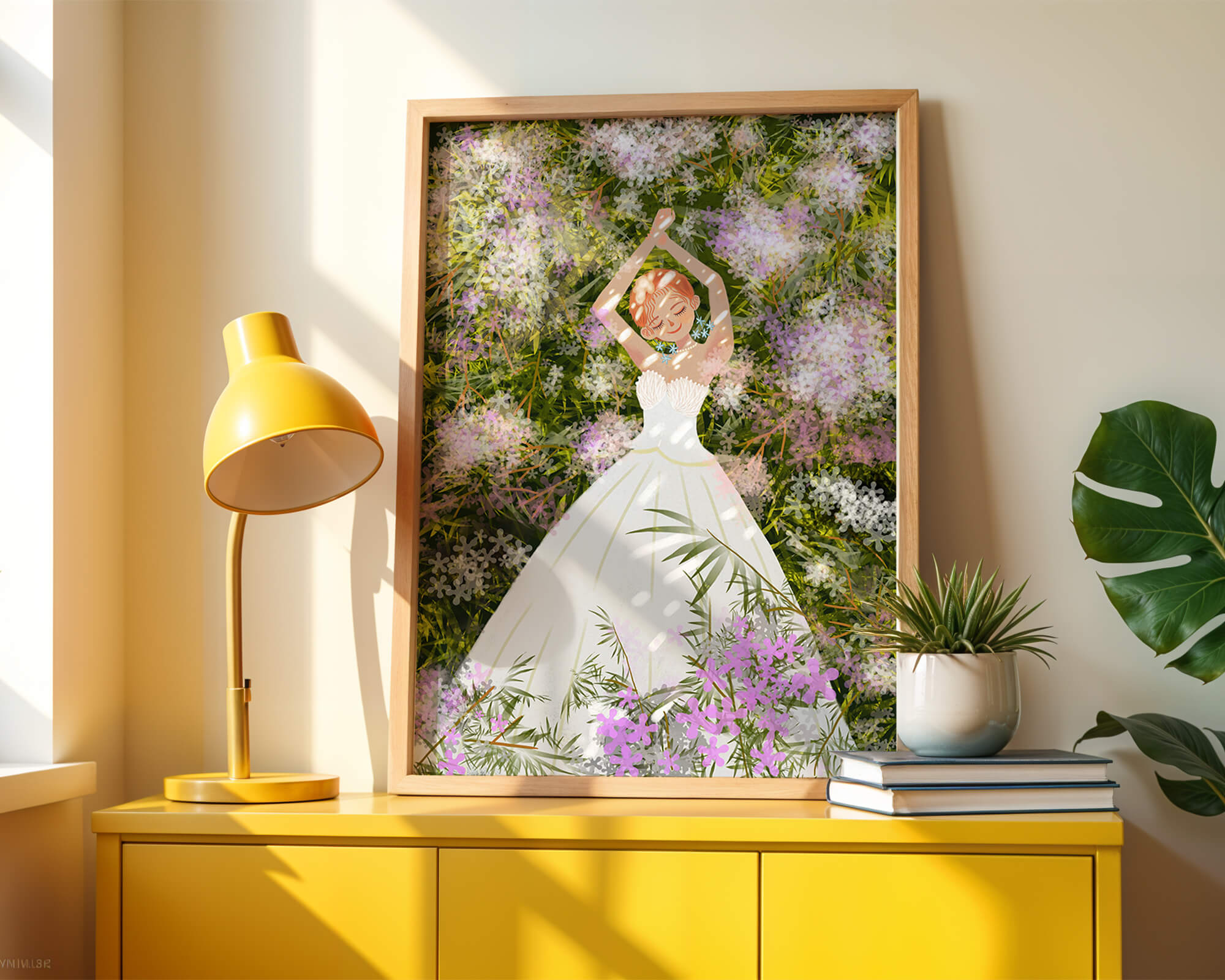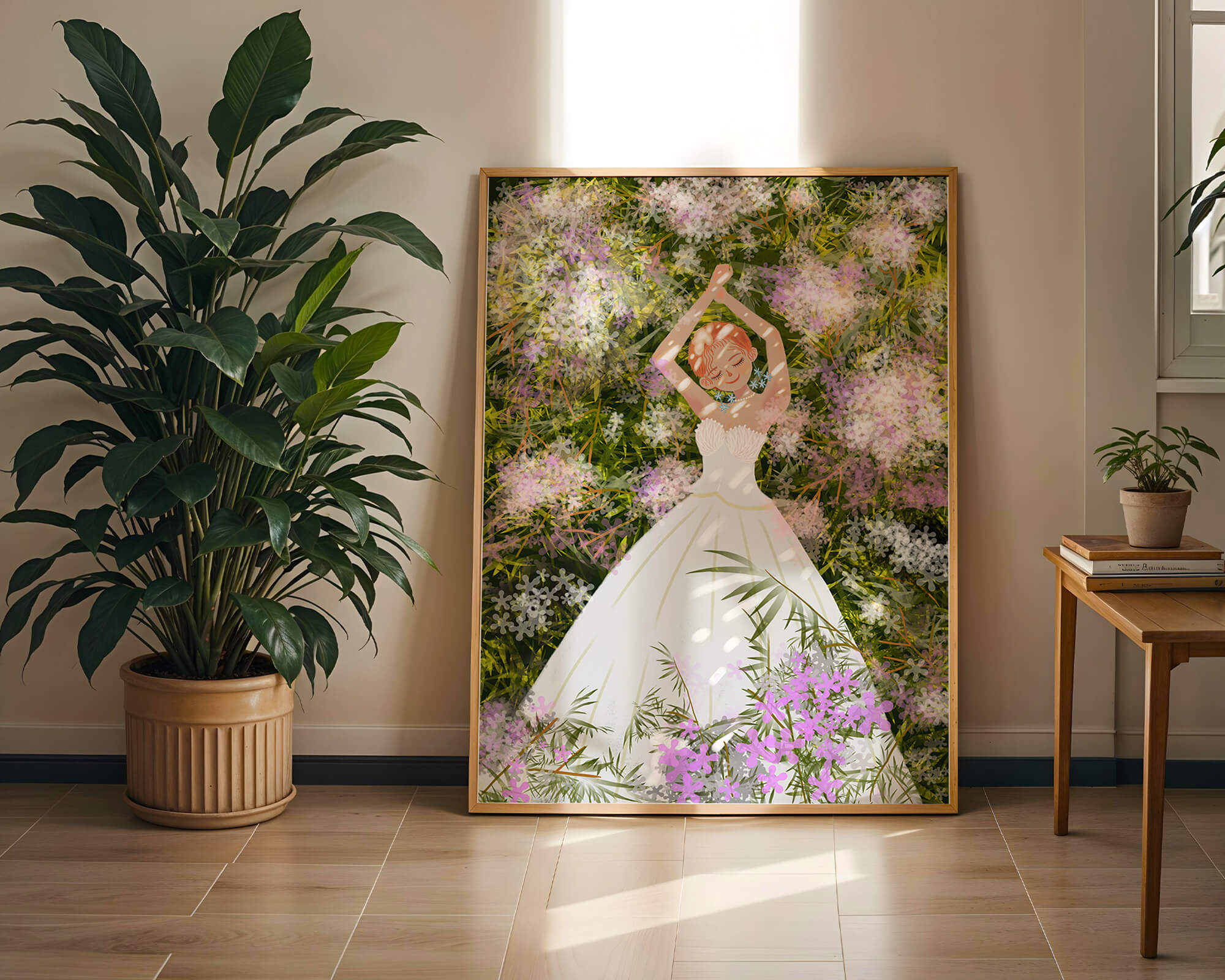 Окруженная пышной зеленью и нежными цветками, женщина кажется умиротворенной, ее руки мягко вытянуты над головой. Солнечный свет проникает сквозь листву, бросая мягкое свечение на ее платье и подчеркивая яркую палитру цветов в саду. Эта иллюстрация создает причудливую и романтическую атмосферу, приглашая зрителей представить себе момент тихой радости и блаженства в объятиях природы. Композиция гармонично сочетает нежные оттенки пастельных цветов с насыщенными зелеными тонами листьев, создавая спокойную и зачаровывающую среду. Сцену можно представить как сказочное свадебное окружение или просто мгновение чистого расслабления и единения с природным миром.