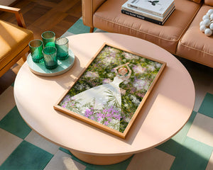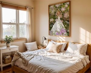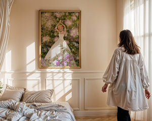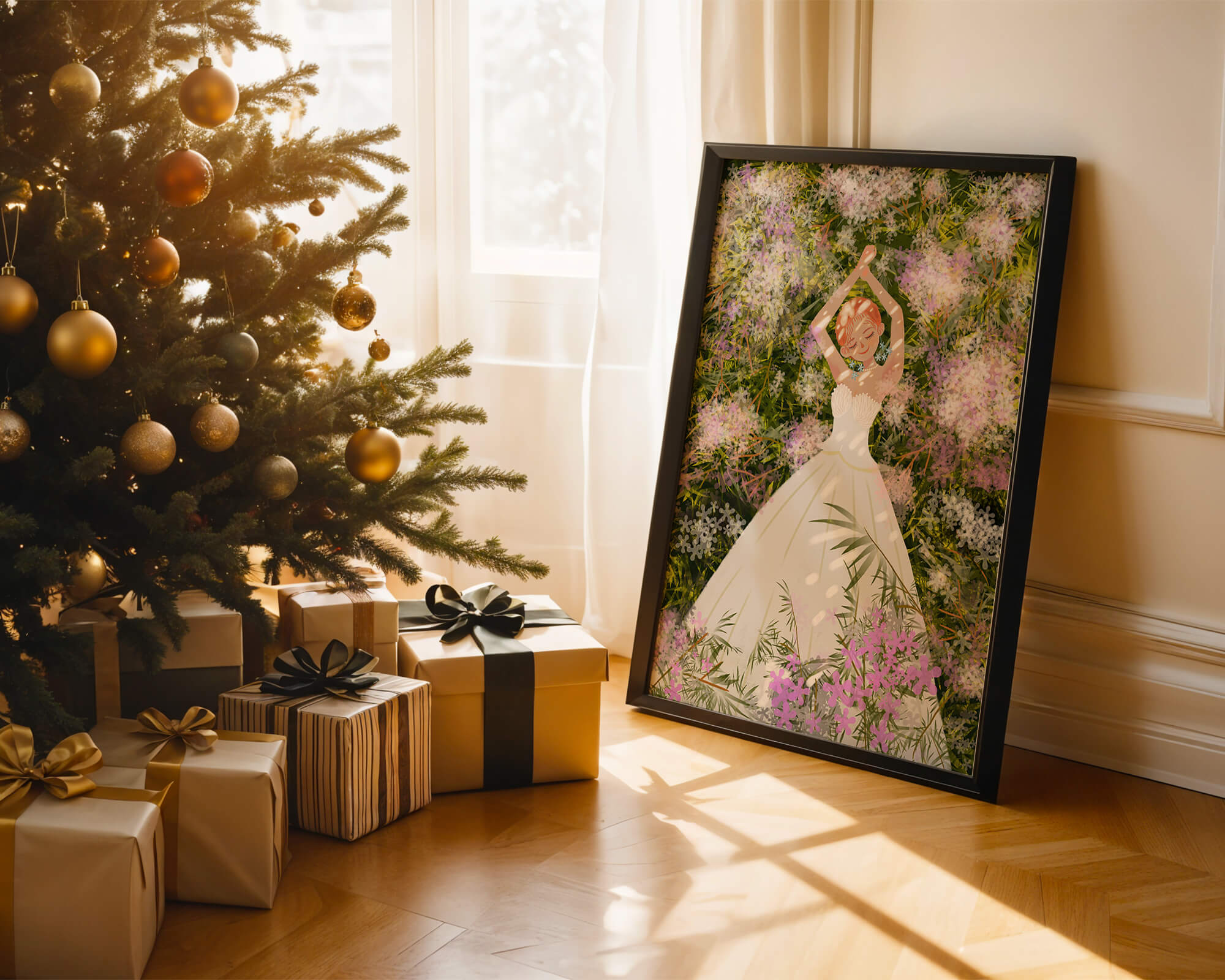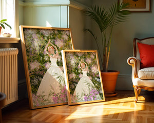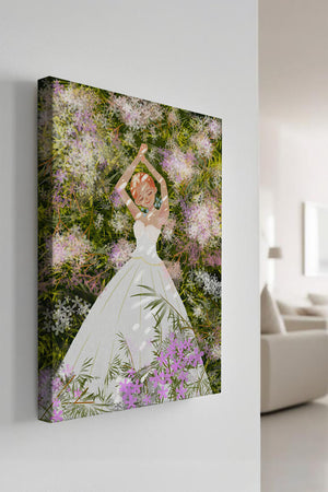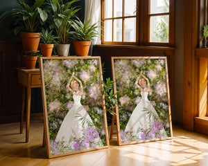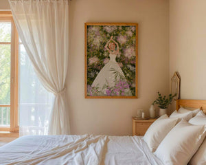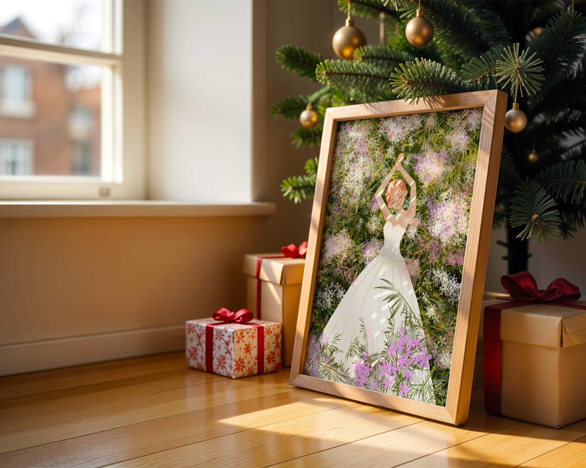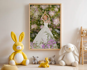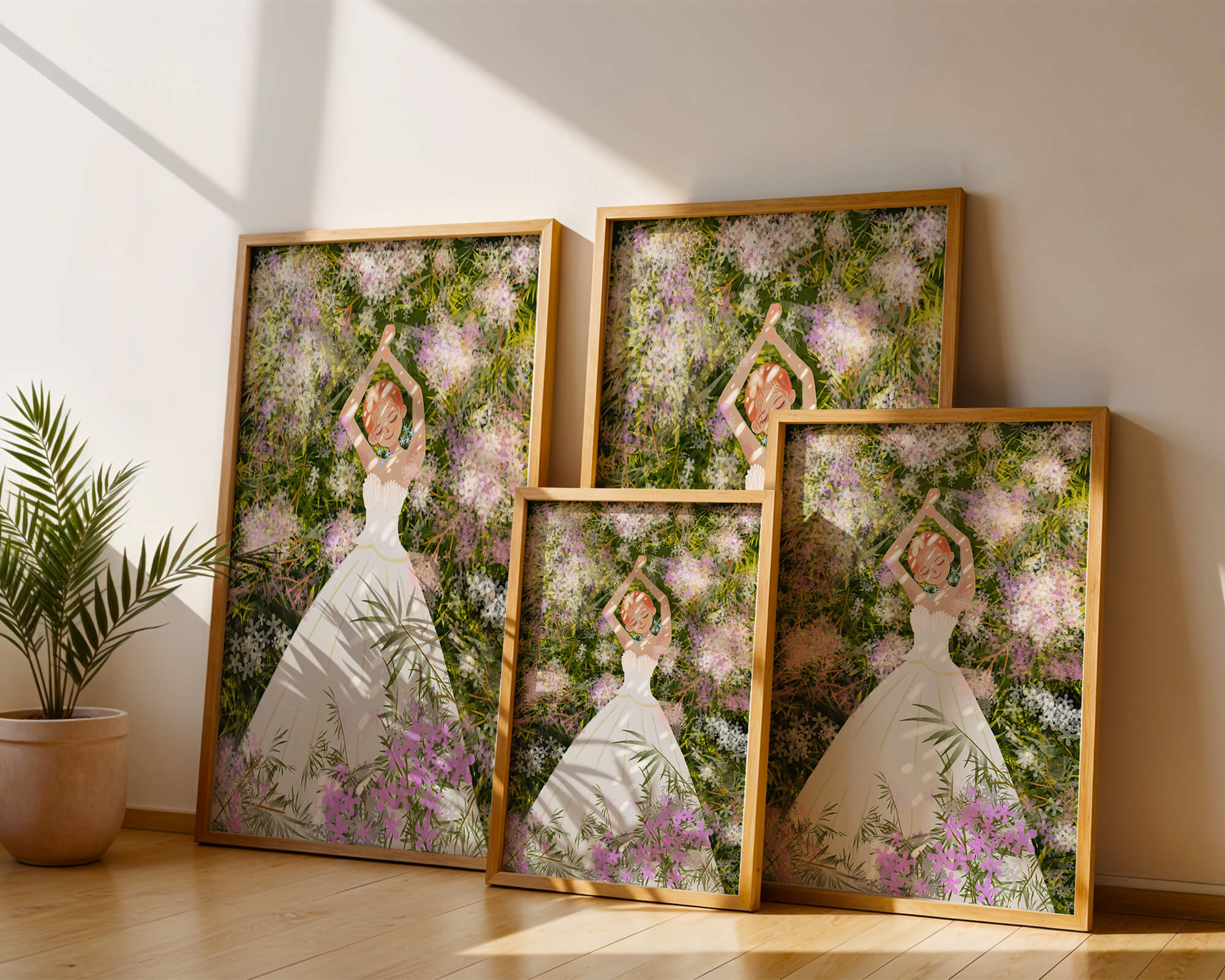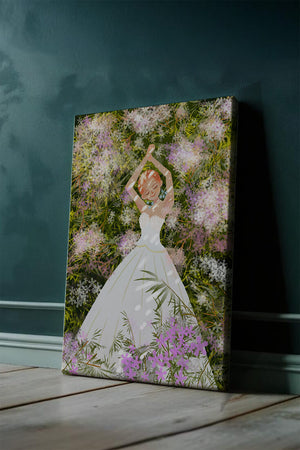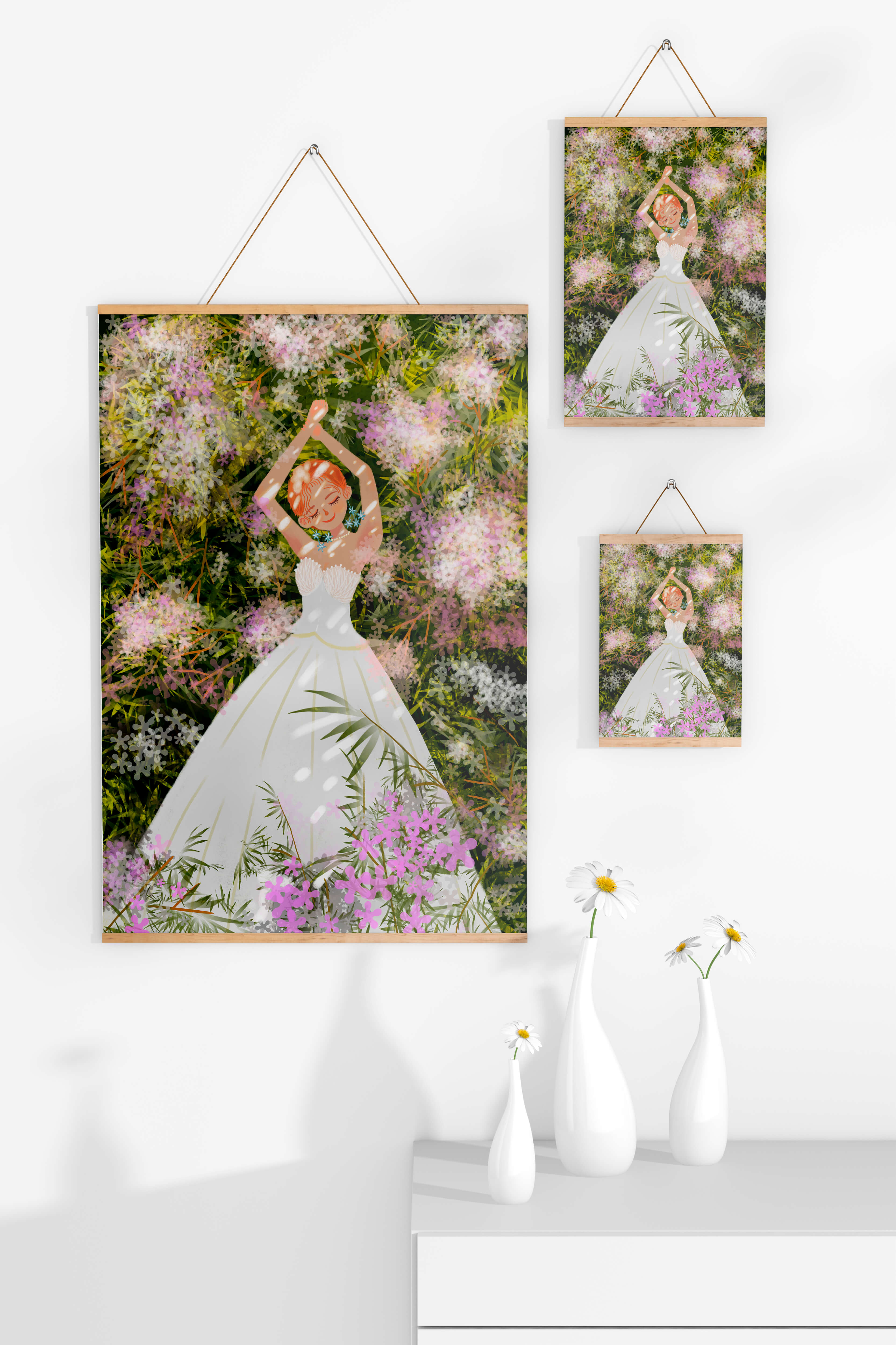 Окруженная пышной зеленью и нежными цветками, женщина кажется умиротворенной, ее руки мягко вытянуты над головой. Солнечный свет проникает сквозь листву, бросая мягкое свечение на ее платье и подчеркивая яркую палитру цветов в саду. Эта иллюстрация создает причудливую и романтическую атмосферу, приглашая зрителей представить себе момент тихой радости и блаженства в объятиях природы. Композиция гармонично сочетает нежные оттенки пастельных цветов с насыщенными зелеными тонами листьев, создавая спокойную и зачаровывающую среду. Сцену можно представить как сказочное свадебное окружение или просто мгновение чистого расслабления и единения с природным миром.