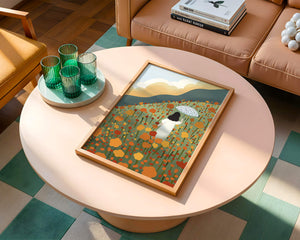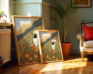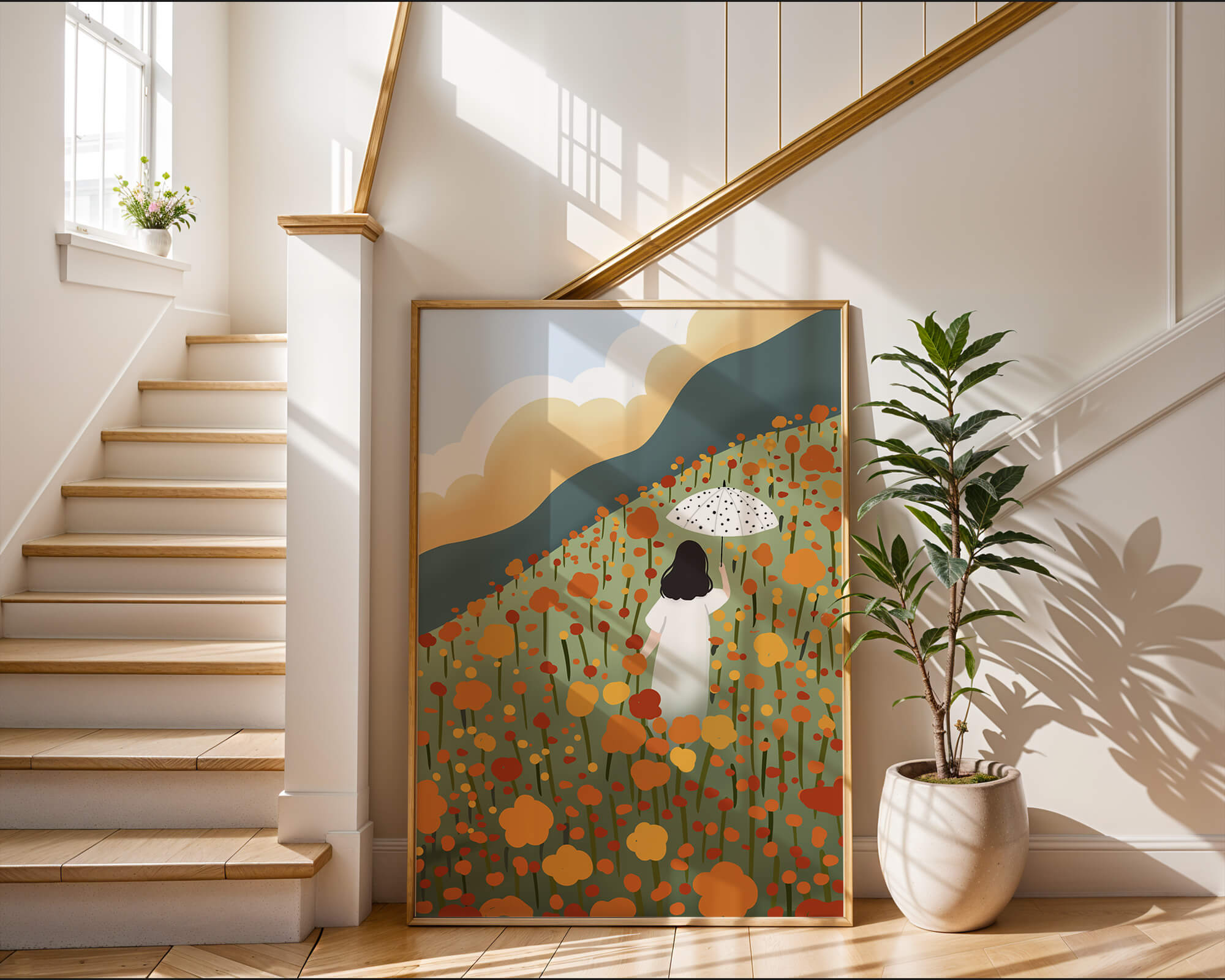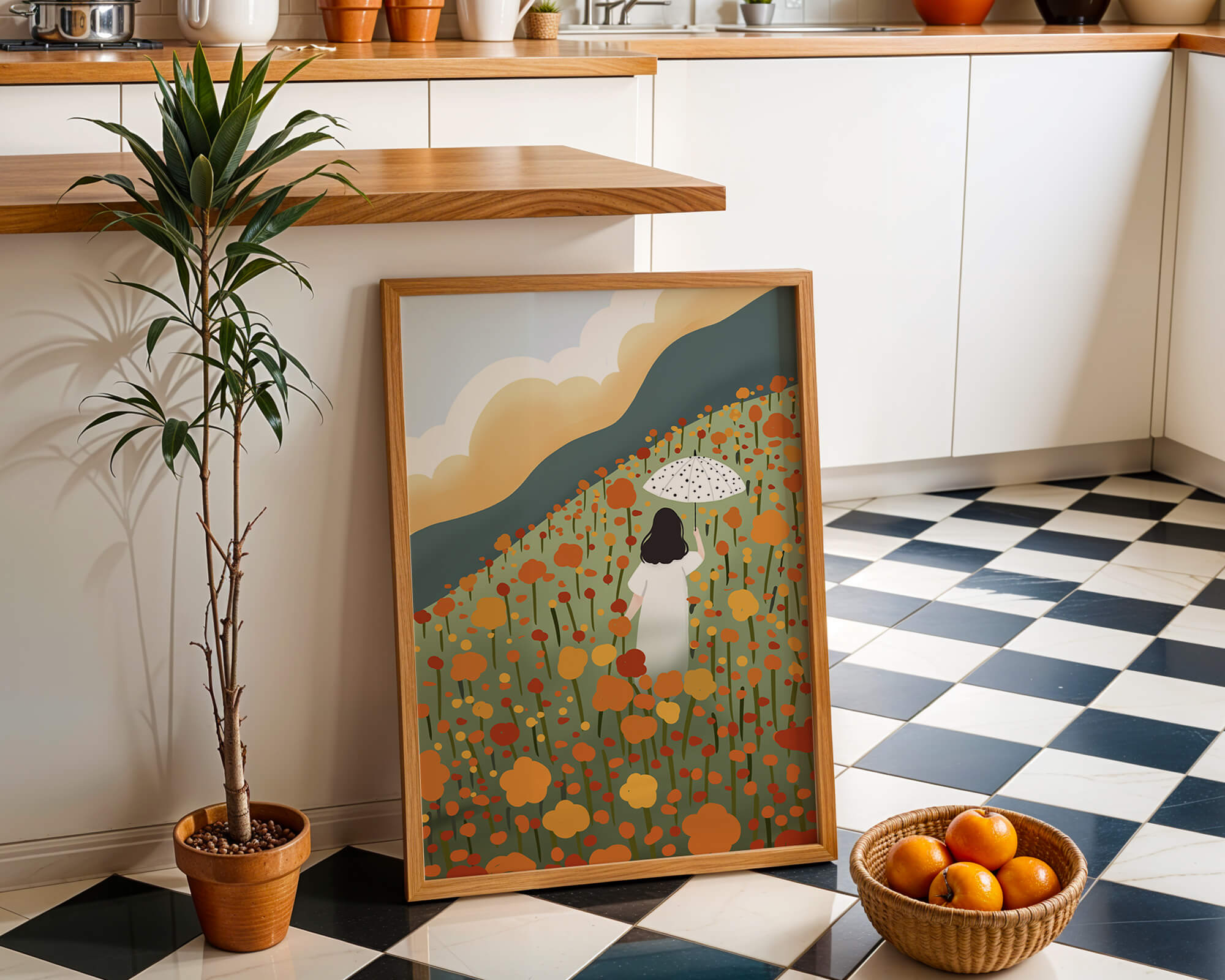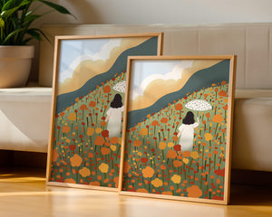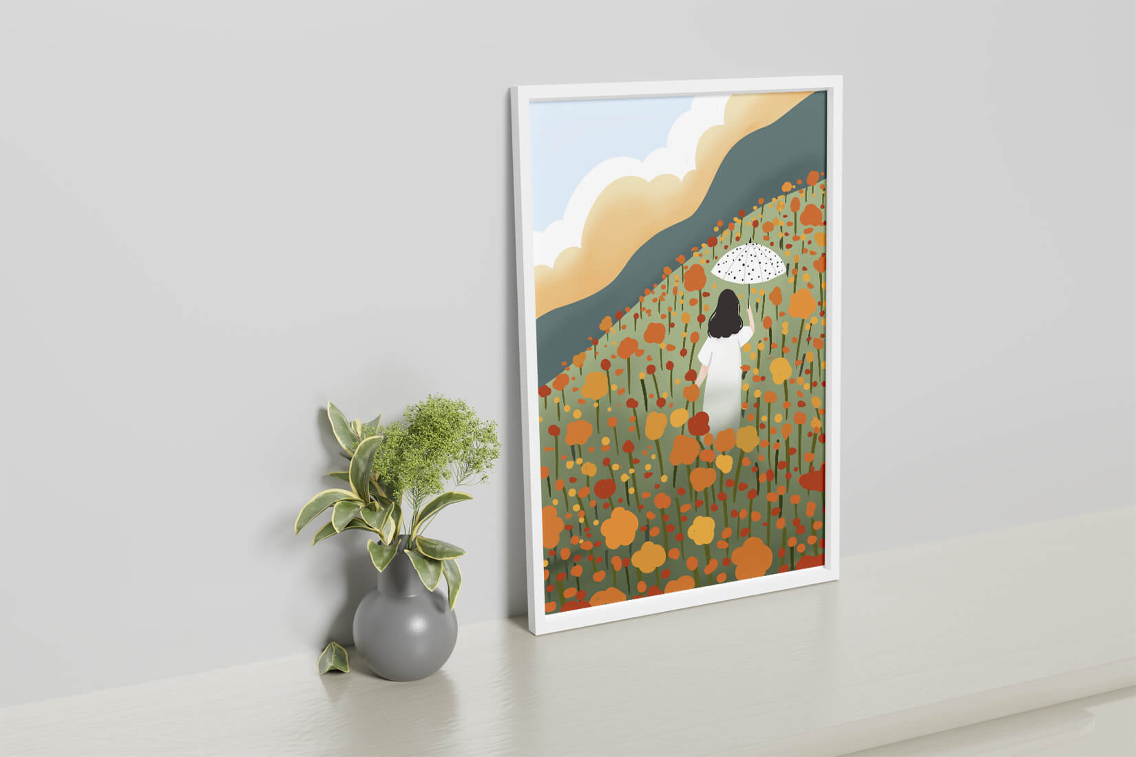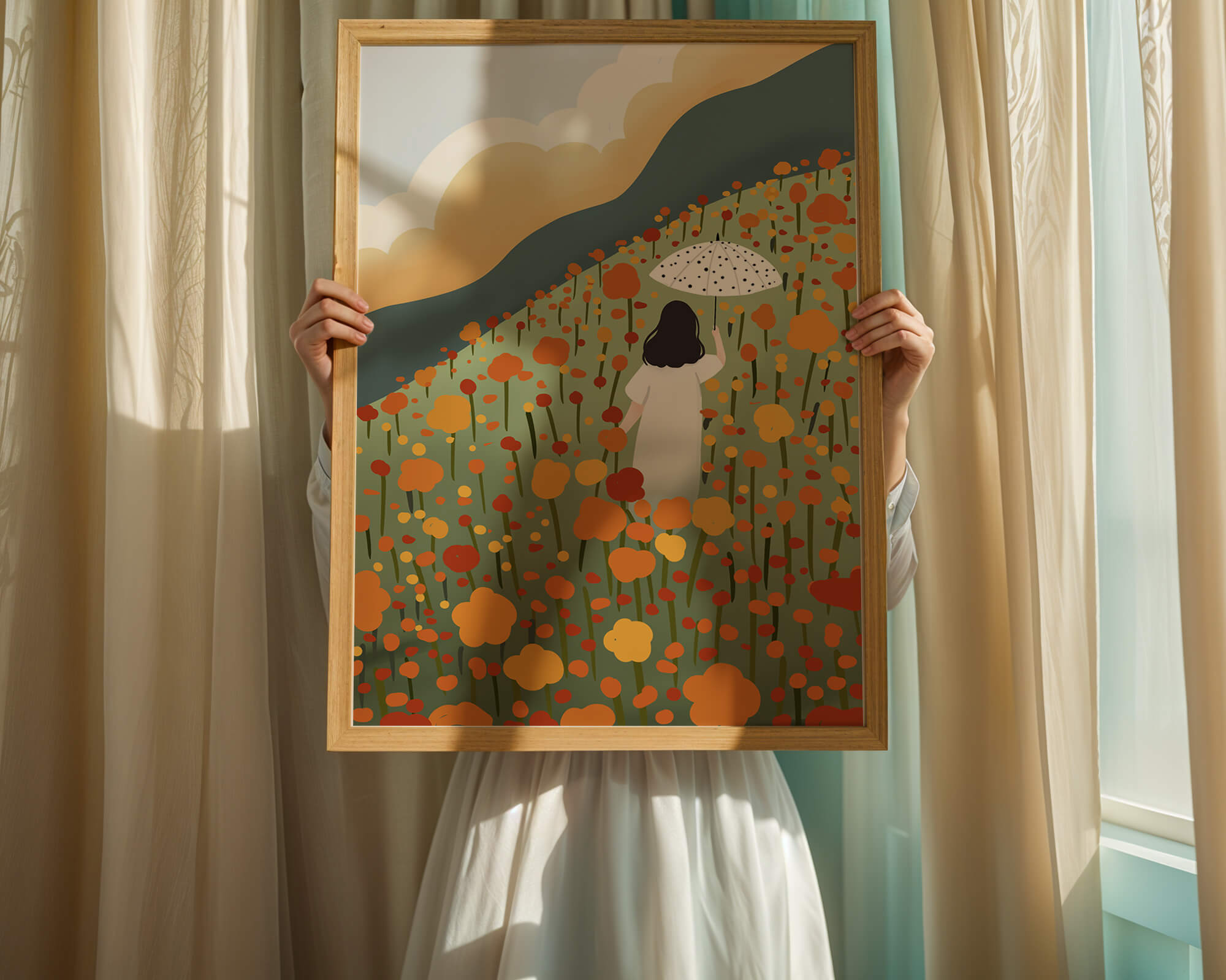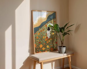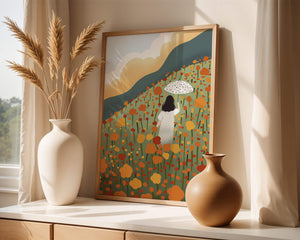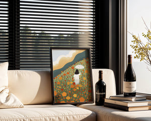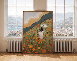 This artwork captures the beauty of nature in its full bloom. The woman, dressed in white, stands out against a backdrop of colorful flowers that cover the hillside. The use of bright oranges and yellows in the floral arrangement evokes a feeling of warmth and joy.