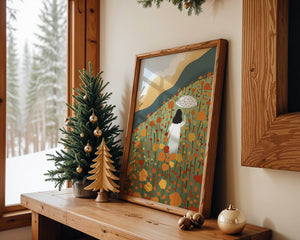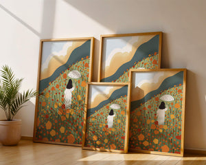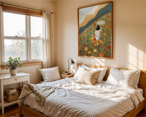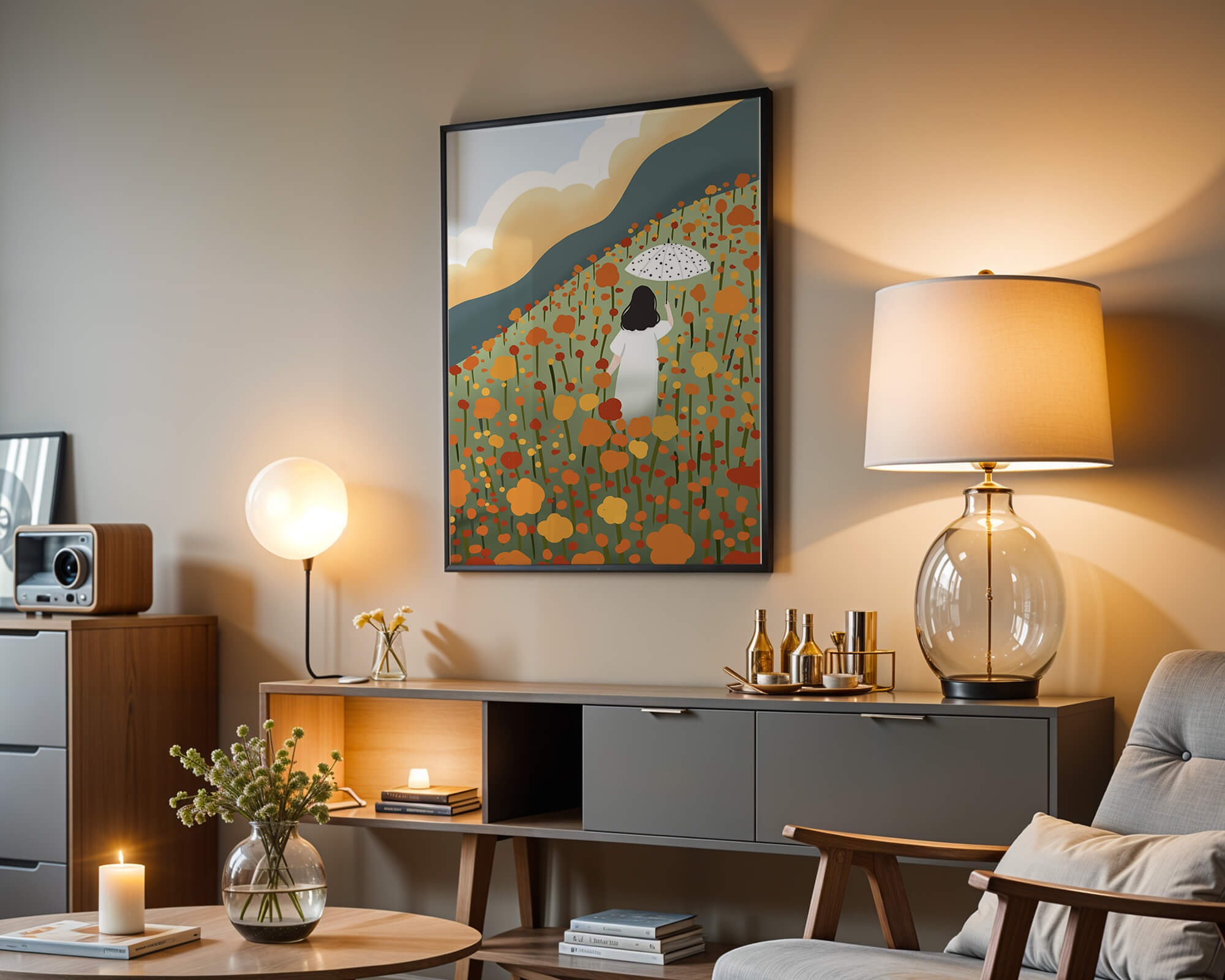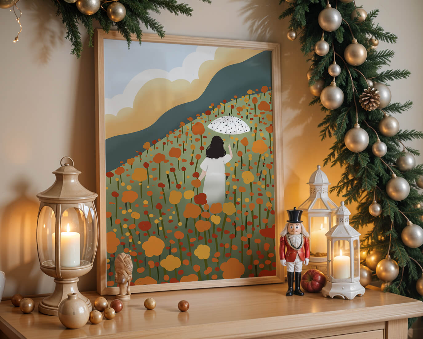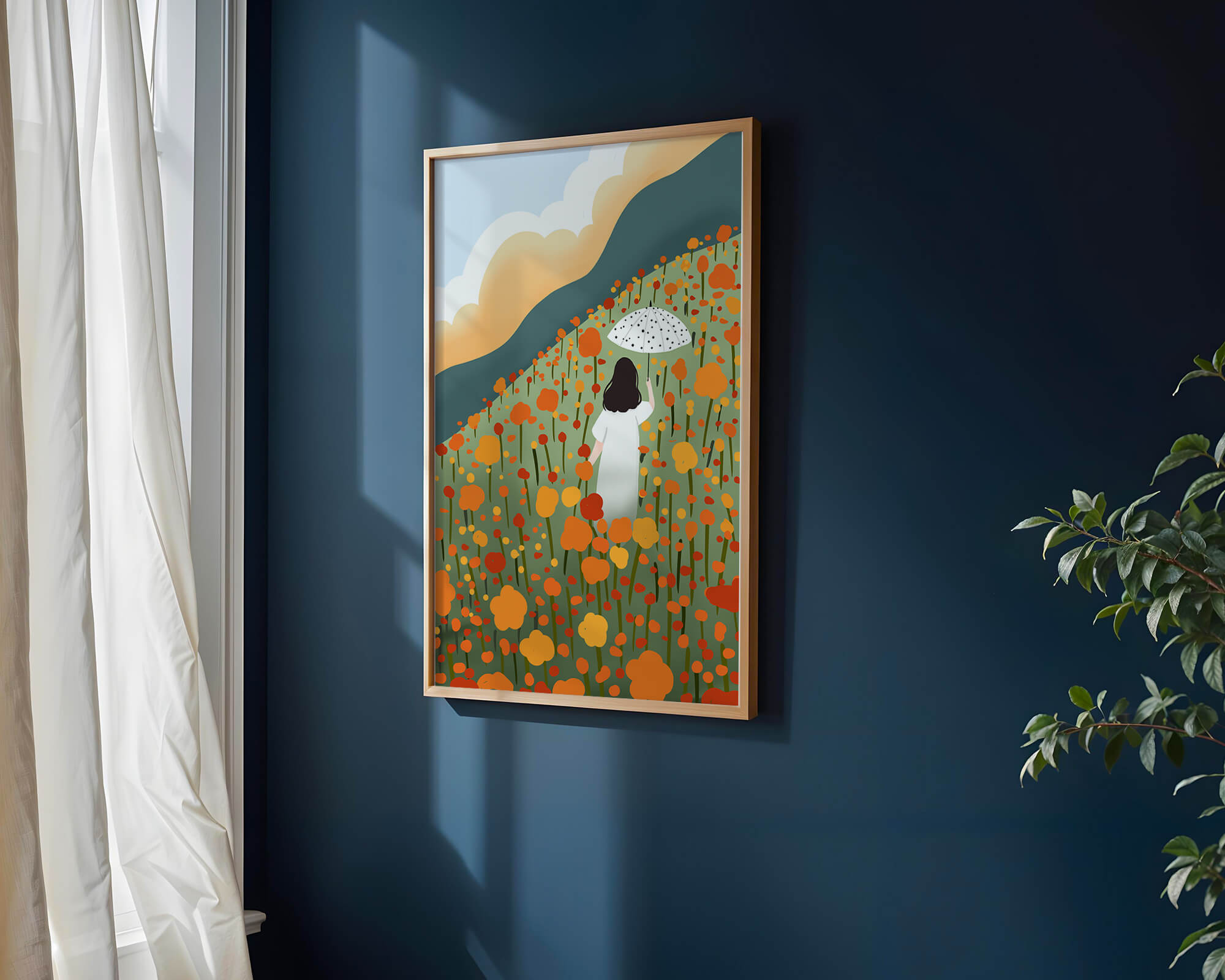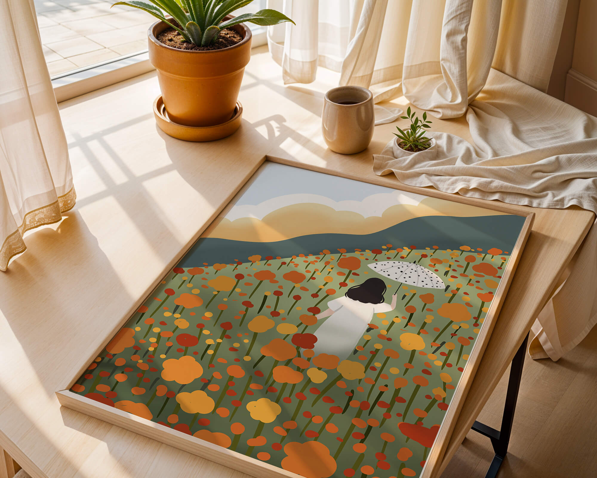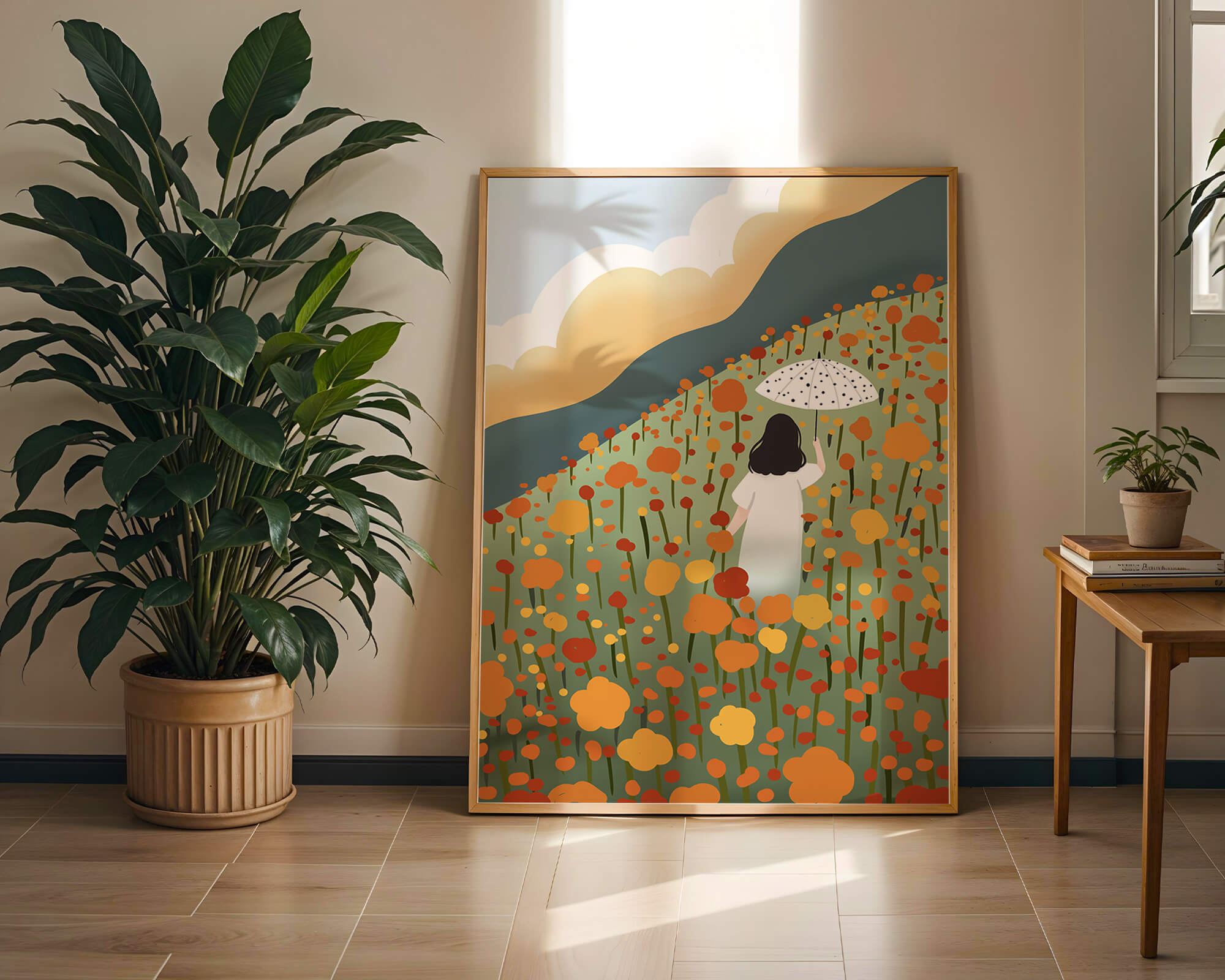 This artwork captures the beauty of nature in its full bloom. The woman, dressed in white, stands out against a backdrop of colorful flowers that cover the hillside. The use of bright oranges and yellows in the floral arrangement evokes a feeling of warmth and joy.