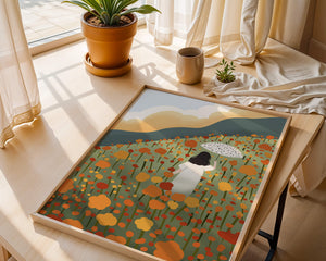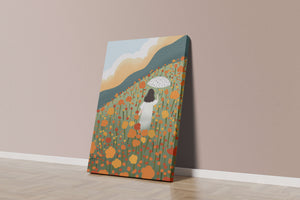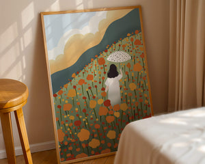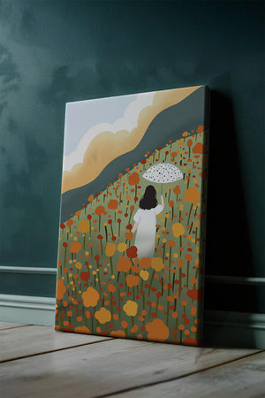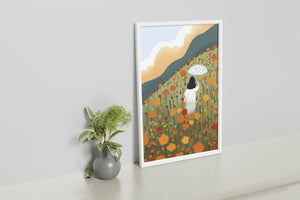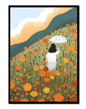 A serene scene depicting a woman walking with an umbrella through a vibrant field of blooming flowers on a sunny day. The landscape is filled with orange and yellow flowers, creating a sense of peace and tranquility.