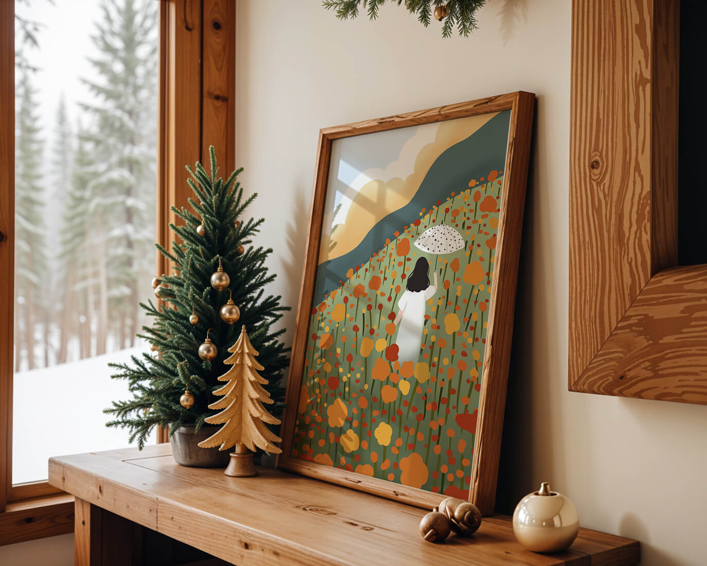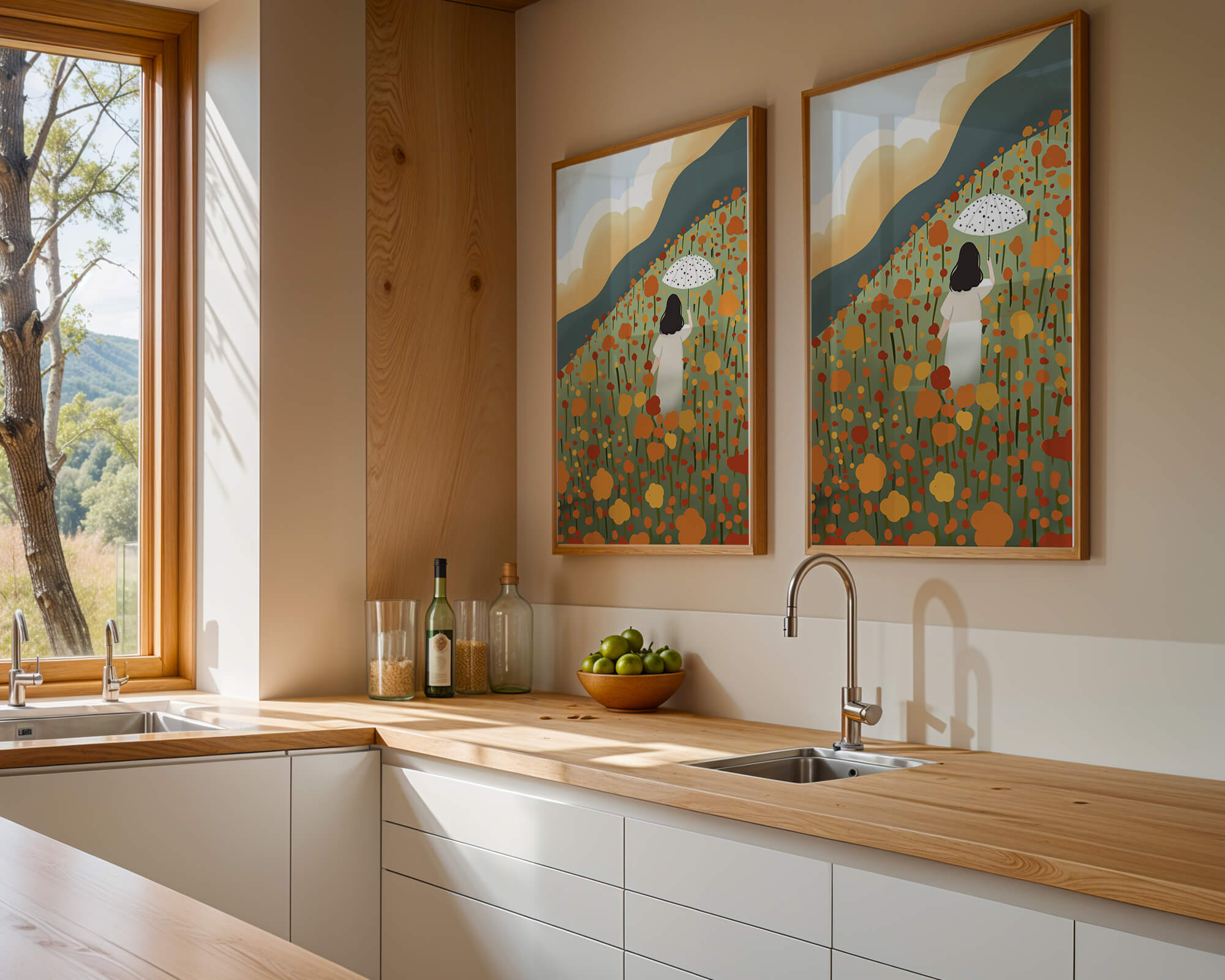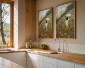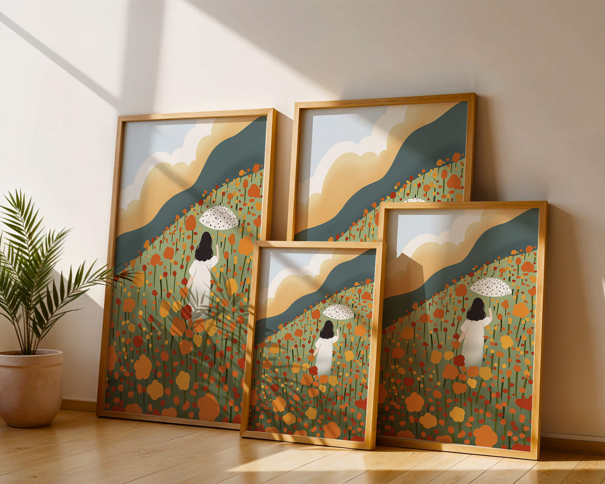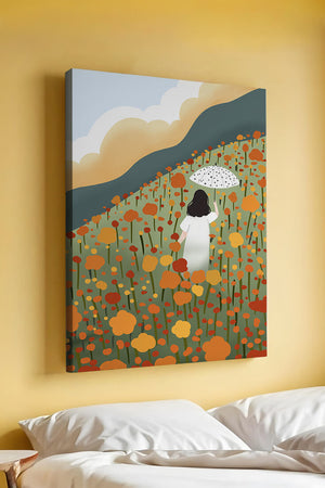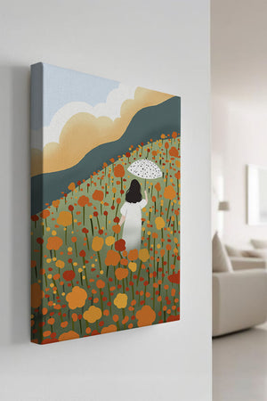 The umbrella in her hand, dotted with patterns, adds an element of charm and style to the composition. This piece, with its harmonious blend of colors and serene imagery, would make a perfect addition to any space seeking a touch of natures elegance.