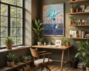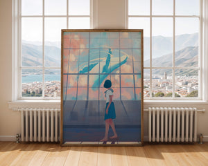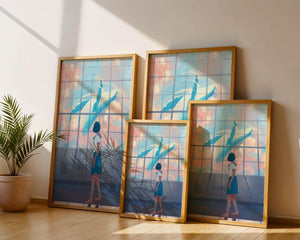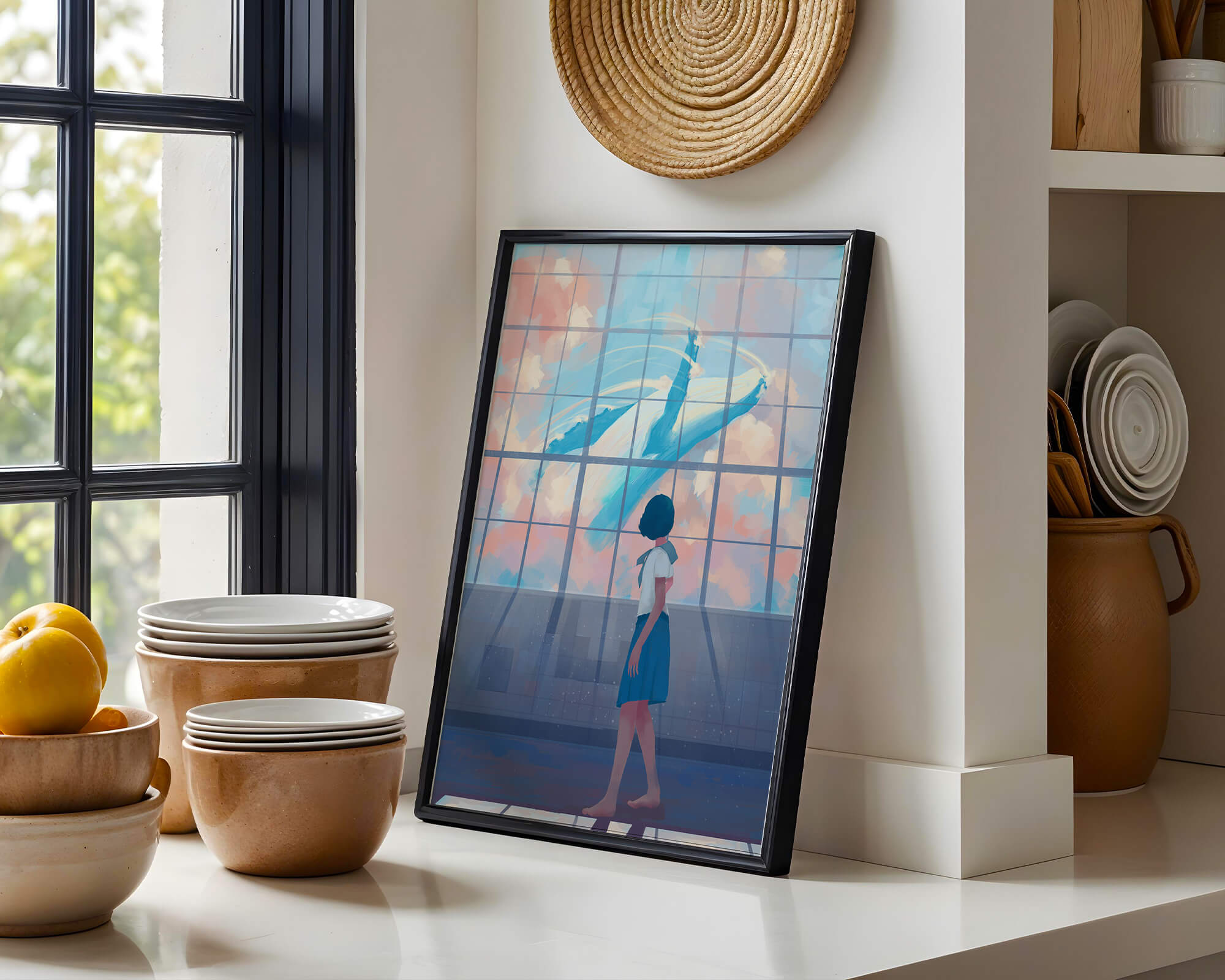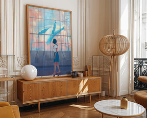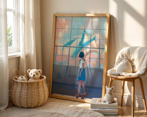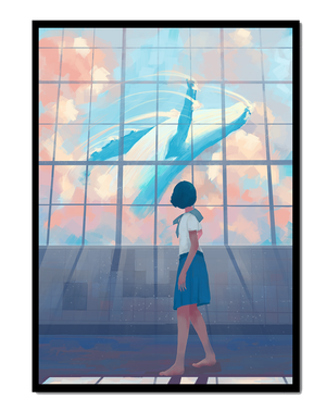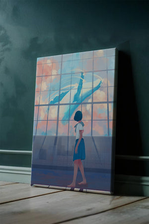 The whale, painted in vibrant blues and whites, appears to float effortlessly among the clouds, turning an ordinary day into a magical moment. The girls expression of amazement and curiosity highlights the power of imagination and the boundless possibilities it brings. The pastel pinks and blues of the sky contrast softly with the girls attire, adding to the harmonious feel of the image. With its blend of reality and fantasy, this image invites viewers to dream and explore their own worlds of imagination. The gentle lighting and subtle shadows add depth and dimension, making the scene feel expansive and alive. Perfect for any room that seeks to inspire and evoke a sense of wonder.| Type |