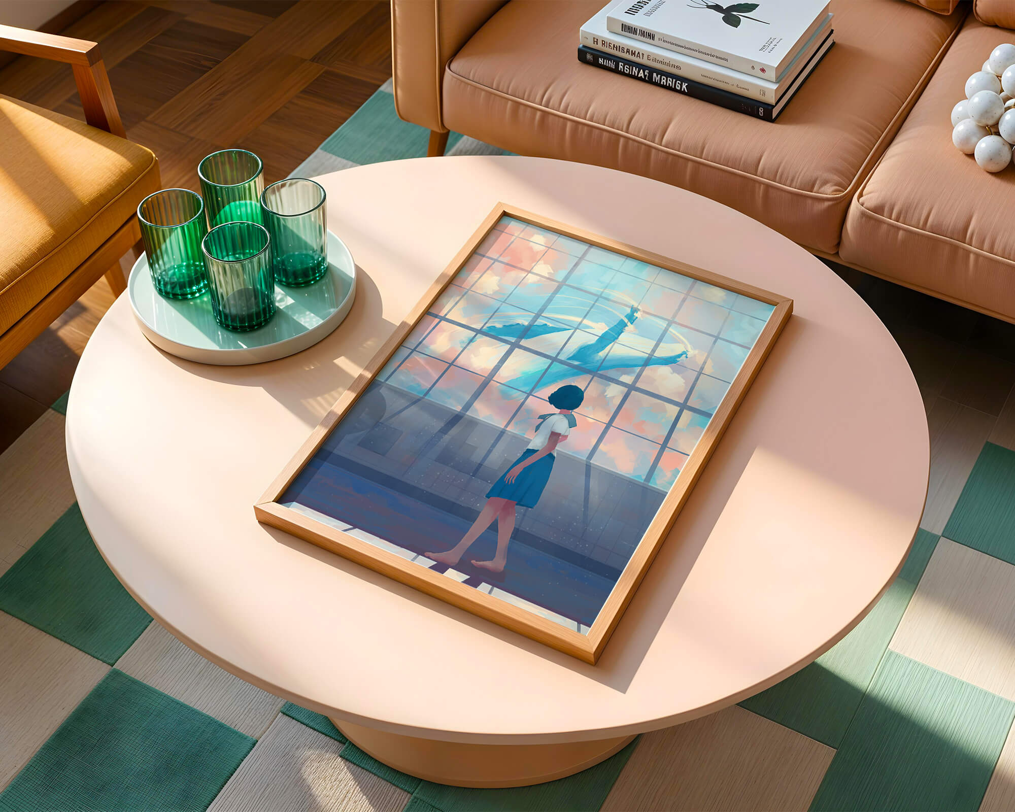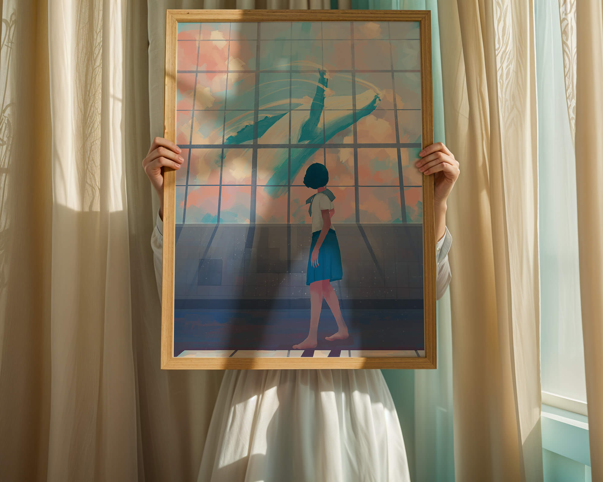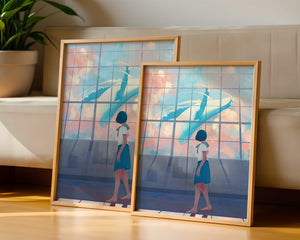 In this captivating image, a young girl dressed in a school uniform gazes in wonder at a giant whale swimming across the sky, visible through a large, grid-like window. The scene is bathed in soft pastel colors, creating a serene and dreamlike atmosphere.